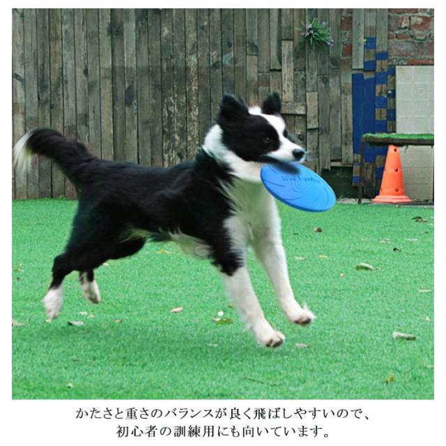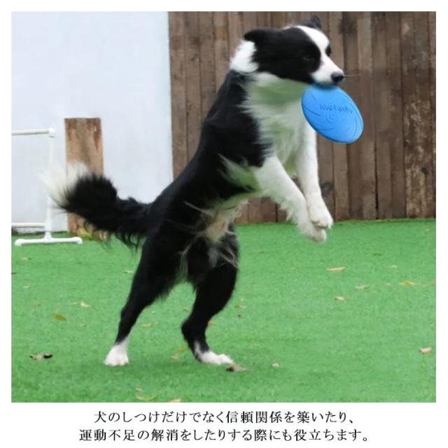 | 飼い主と犬が一緒に楽しめるフリスビー。 直撃しても怪我しにくい柔らかいゴム製。弾力性にも優れており、犬の口や歯茎を傷つけにくいのも魅力です。 表面に独自の凹凸があり、歯が生え変わる時期の犬の歯固めや、歯茎マッサージにも使えます。 かたさと重さのバランスが良く飛ばしやすいので、初心者の訓練用にも向いています。 水に浮くタイプなので、水遊びにも使えます。 裏面はボウルとしても使え、外出先での犬の水分補給やエサ入れとしても使えます。 色が鮮やかで視認性が高く、公園の草むらなどに落ちた場合も探しやすいです。 犬のしつけだけでなく信頼関係を築いたり、運動不足の解消をしたりする際にも役立ちます。 | |