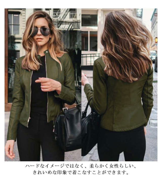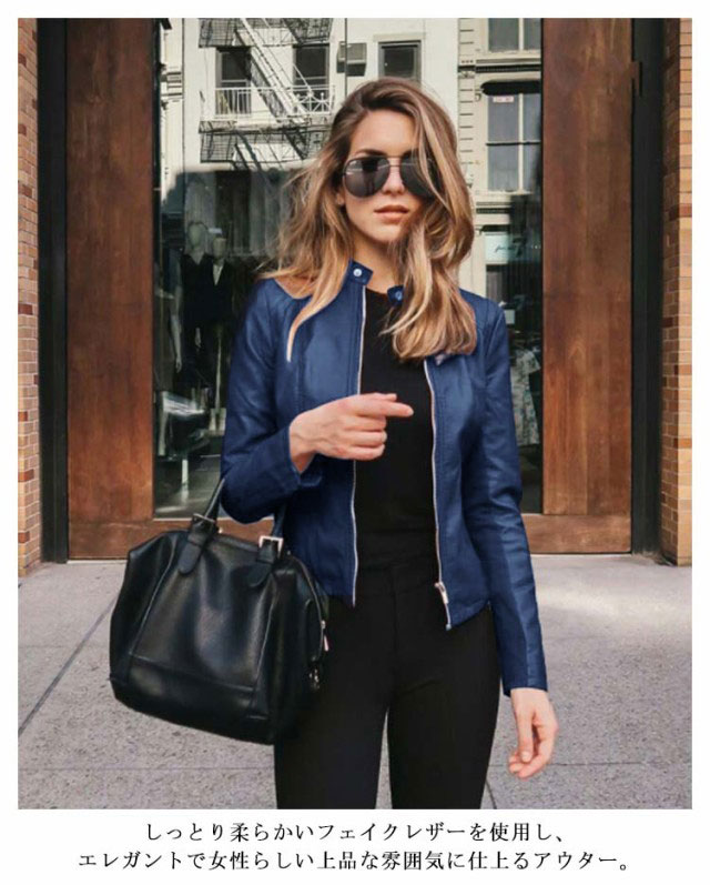 | ピリッと辛口な印象の、春や秋に活躍するPUレザーのライダースジャケット。 ハードなイメージではなく、柔らかく女性らしい、きれいめな印象で着こなすことができます。 雨や汚れに強いPUレザーはお手入れもラクにでき、デイリー使いがしやすく、コーディネートの幅を広げてくれます。 しっとり柔らかいフェイクレザーを使用し、エレガントで女性らしい上品な雰囲気に仕上るアウター。 程よいショート丈で、スッキリと大人な着こなしが楽しめるジャンバーです。 | |