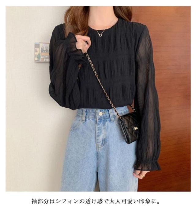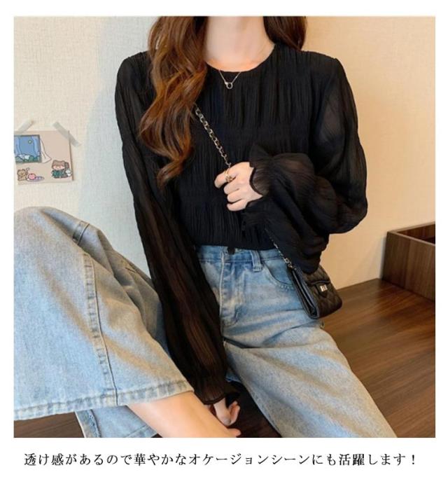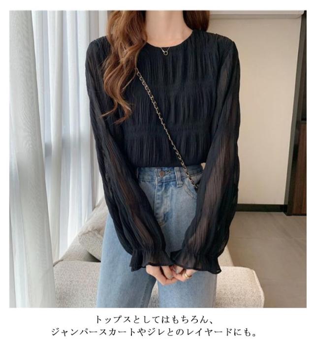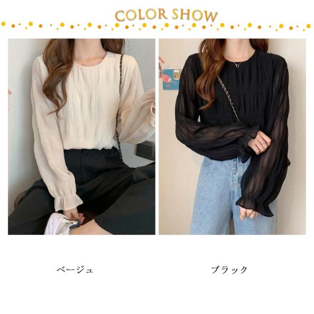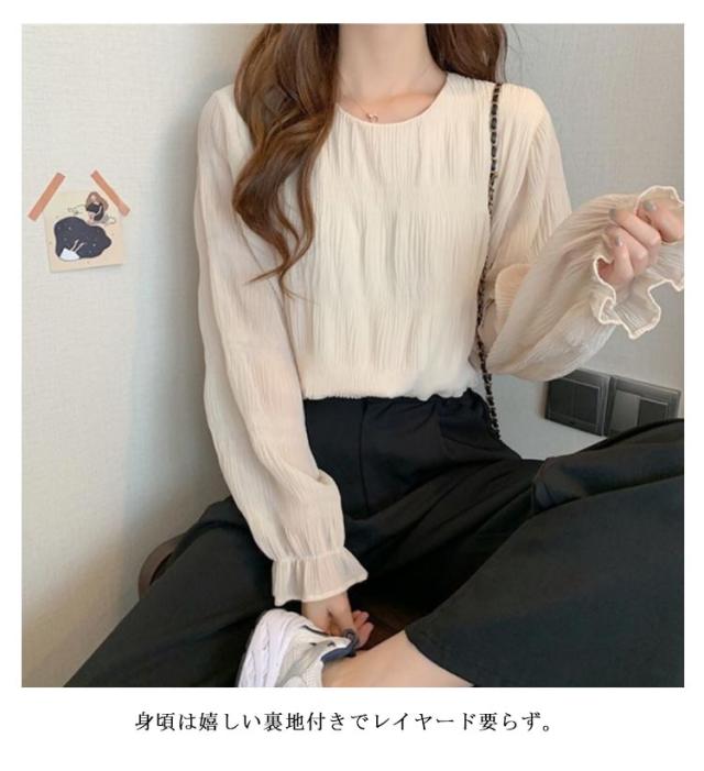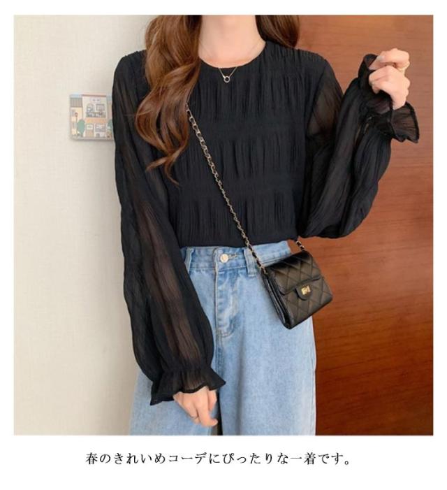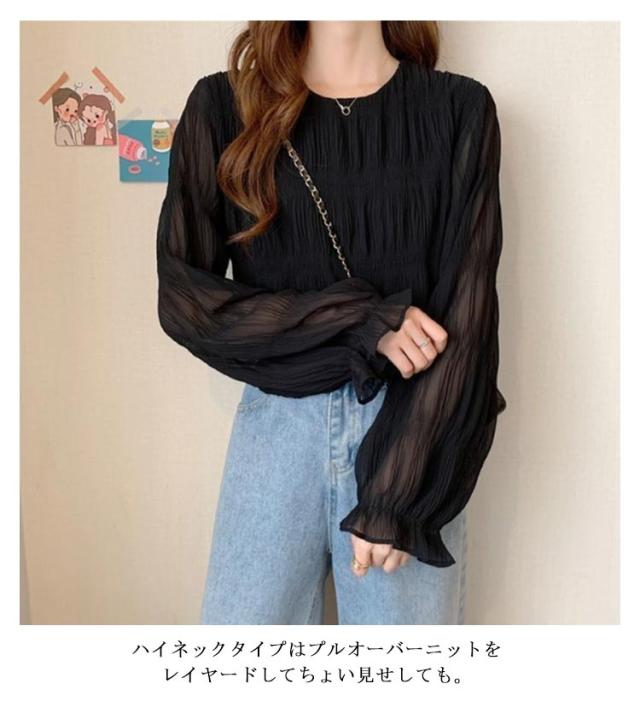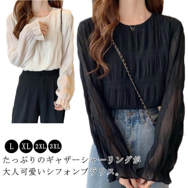 ブラウス 春 シフォン シャーリング ギャザー レディース シアー レース 裏地付き トップス シアートップス レイヤード ハイネック Uネック フリル フレア袖 送料無料 シンプル 春 夏 秋 L-3XL