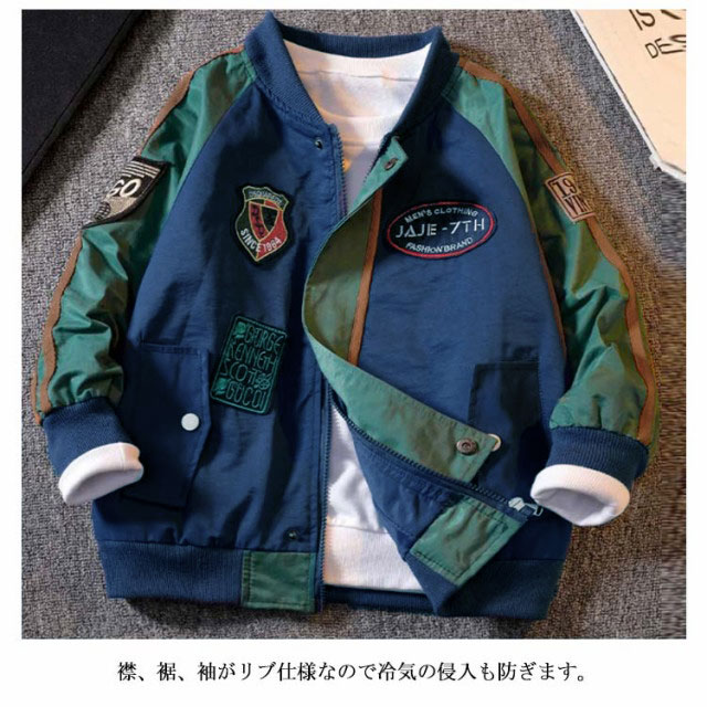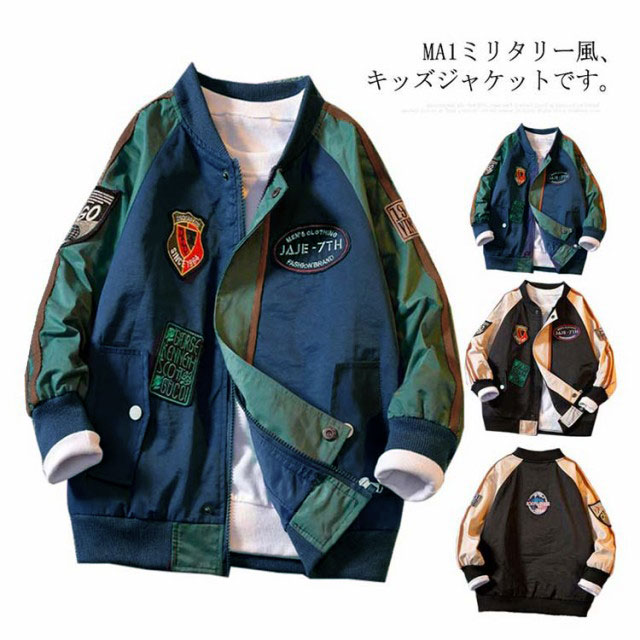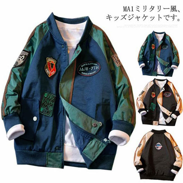 | MA1ミリタリー風、キッズジャケットです。 背面の大きなロゴ刺繍や胸元のワッペンなどがおしゃれなジャンパー。 襟、裾、袖がリブ仕様なので冷気の侵入も防ぎます。 便利な両サイドにポケット付き、ファスナー式で着脱も楽々。 | |