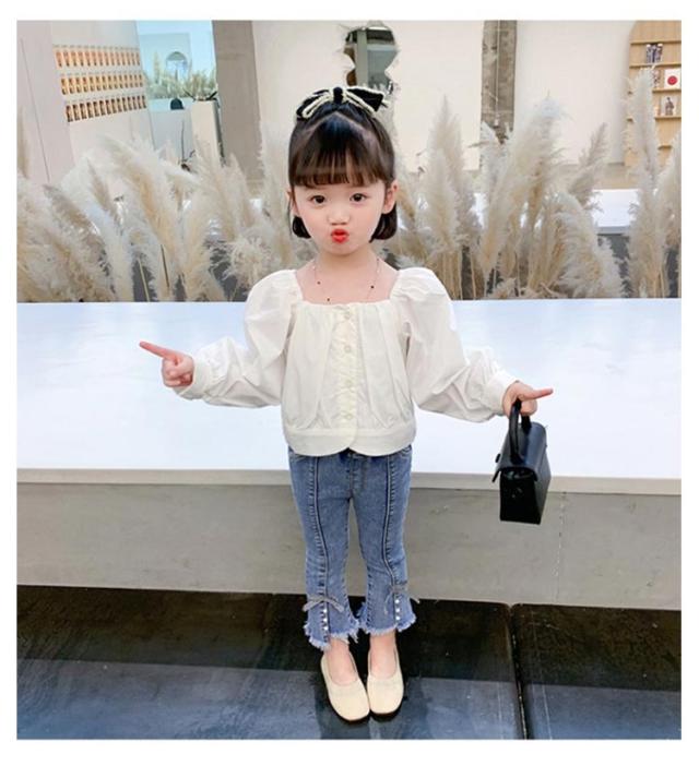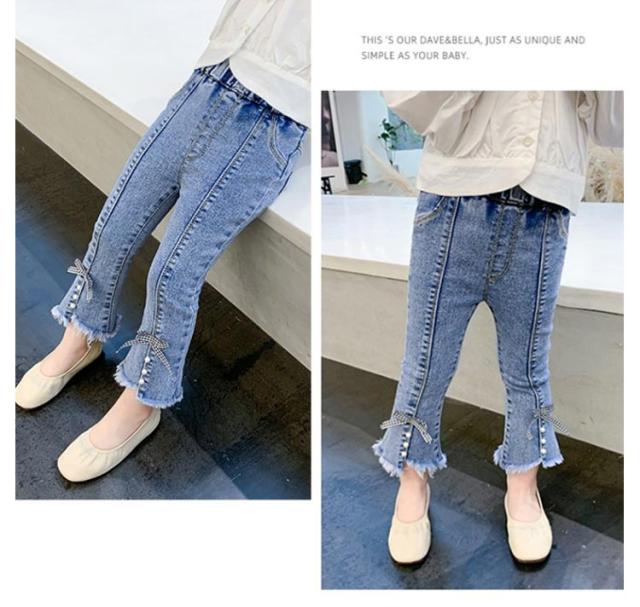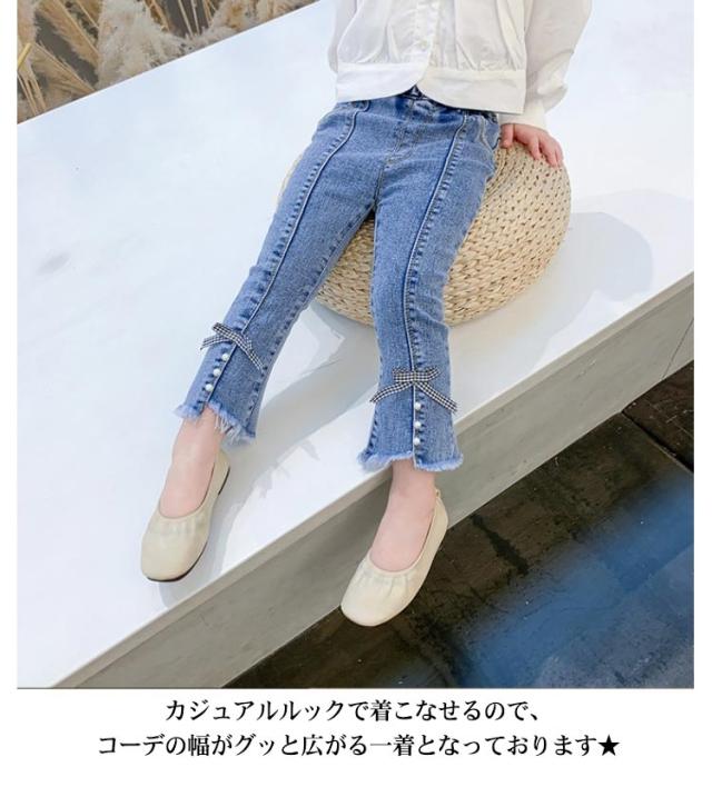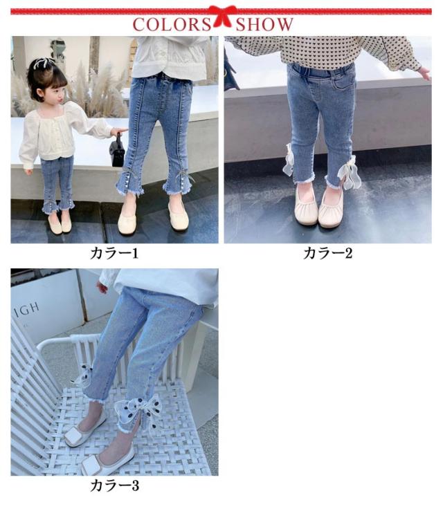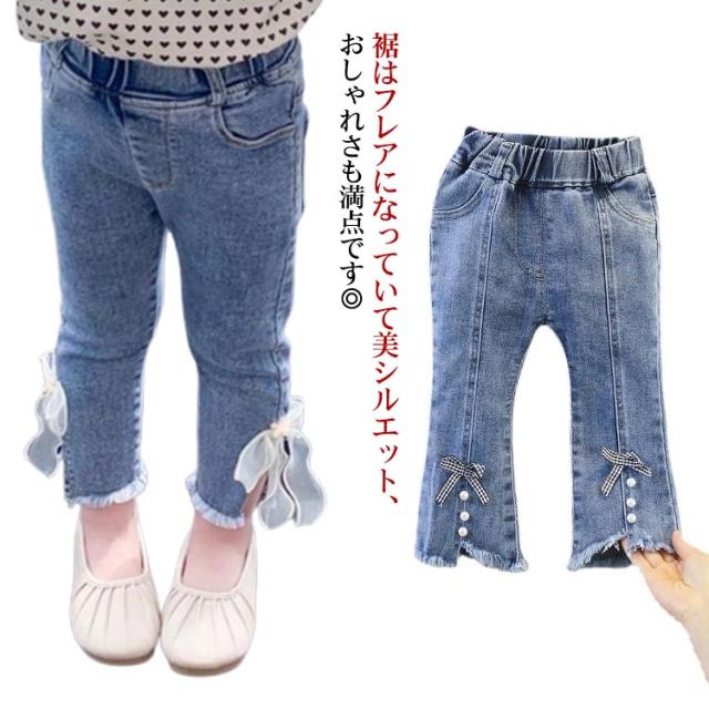 子供 デニム パンツ フレアパンツ ダメージ ジーンズ ボトムス ジーパン キッズ 女の子 ロングパンツ 裾リボン ベビー 80〜130cm カジュアル おしゃれ 可愛い 子ども服 春 秋 韓国子供服 ストレッチ 送料無料