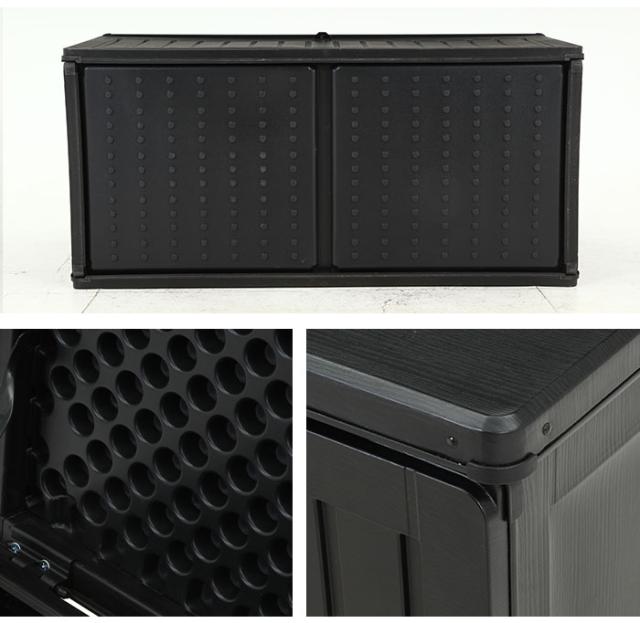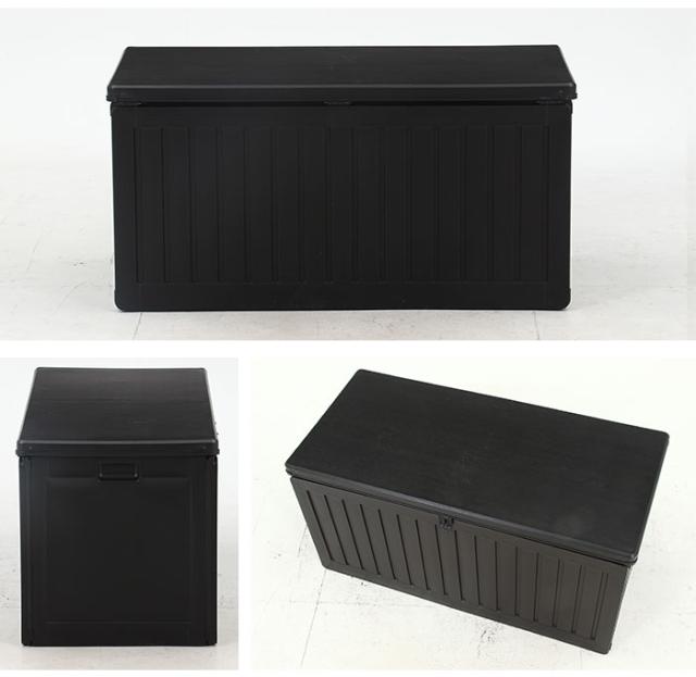 座れる 収納ボックス 屋外 270L 屋外収納 木目調 ブラック おしゃれ 幅109 奥行51.5 高さ55 cm 収納ベンチ 耐荷重 100kg 防水 鍵穴付 屋外物置 ベンチ ストッカー 大容量 収納庫 宅配ボックス 縁台 腰掛け