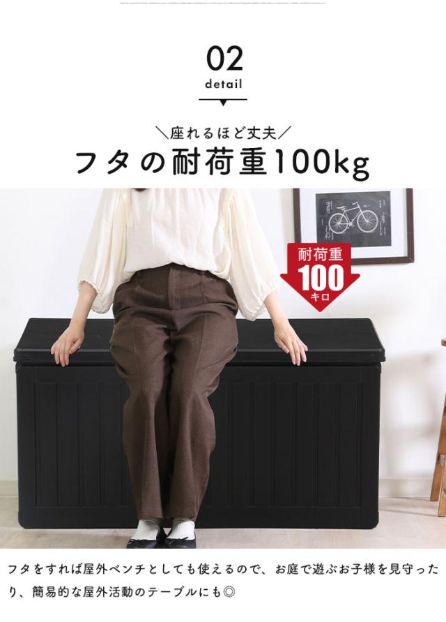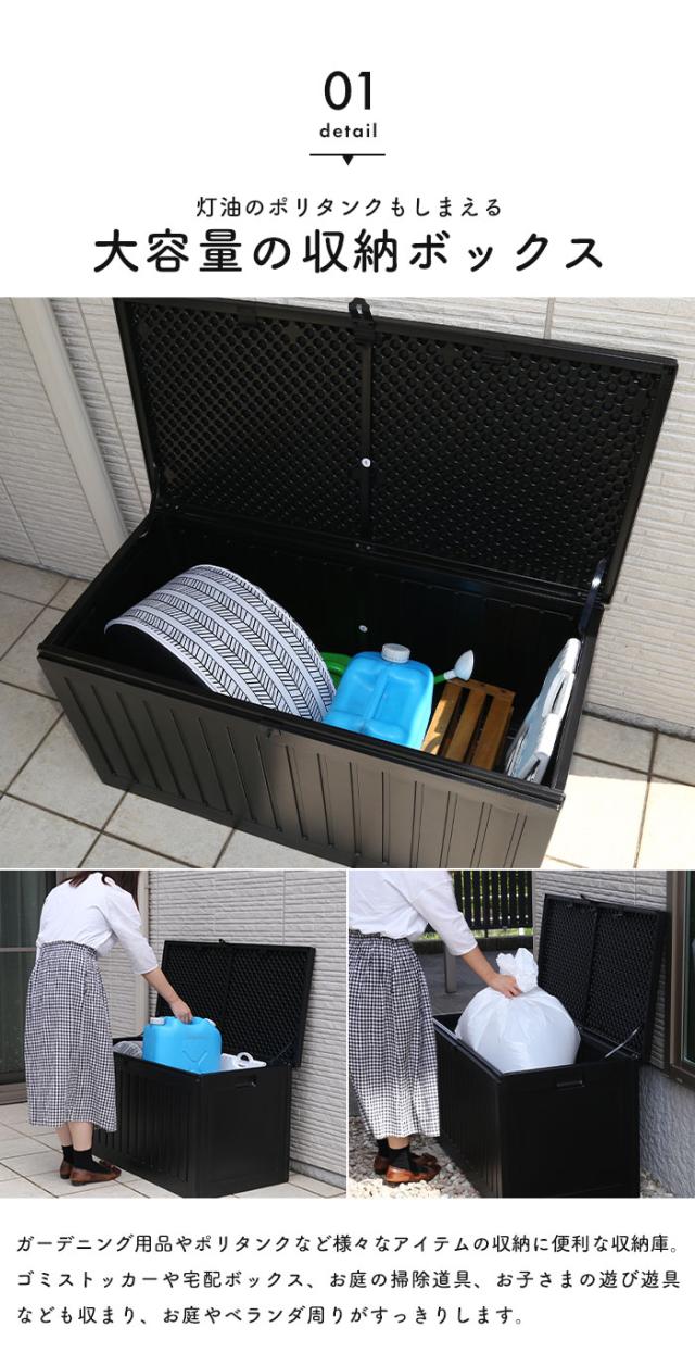 | 屋内でも屋外でも使用できる便利な収納ボックス。 ブラックに木目模様が施されたシンプルなデザインで、玄関先などの屋外やお部屋でもお使いいただけます。 たっぷり収納できるので、ポリタンク収納やゴミ箱、ガーデニング用品の道具入れなど様々なシーンで大活躍。 真空成型されたプラスチック製なので、強度を保ちながらも軽く、水にも強い仕様となっています。 (※防水素材ではありますが、雨ざらしでのご使用はお控えください。) くぼみがあり持ち運びやすい設計で、荷物を収納した状態で持ち上げる際の底耐荷重目安は約5〜10kgとなります。 フタは市販の南京錠で施錠できるので、大切な荷物を守ります。 工具不要ではめこむだけの簡単組立。 |