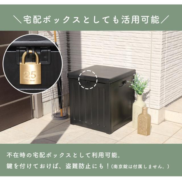 | 屋内でも屋外でも使用できる便利な収納ボックス。 ブラックに木目模様が施されたシンプルなデザインで、玄関先などの屋外やお部屋でもお使いいただけます。 たっぷり収納できるので、ポリタンク収納やゴミ箱、ガーデニング用品の道具入れなど様々なシーンで大活躍。 真空成型されたプラスチック製なので、強度を保ちながらも軽く、水にも強い仕様となっています。 (※防水素材ではありますが、雨ざらしでのご使用はお控えください。) くぼみがあり持ち運びやすい設計で、荷物を収納した状態で持ち上げる際の底耐荷重目安は約5〜10kgとなります。 フタは市販の南京錠で施錠できるので、大切な荷物を守ります。 工具不要ではめこむだけの簡単組立。 |