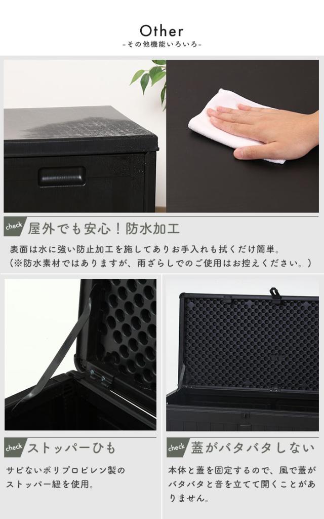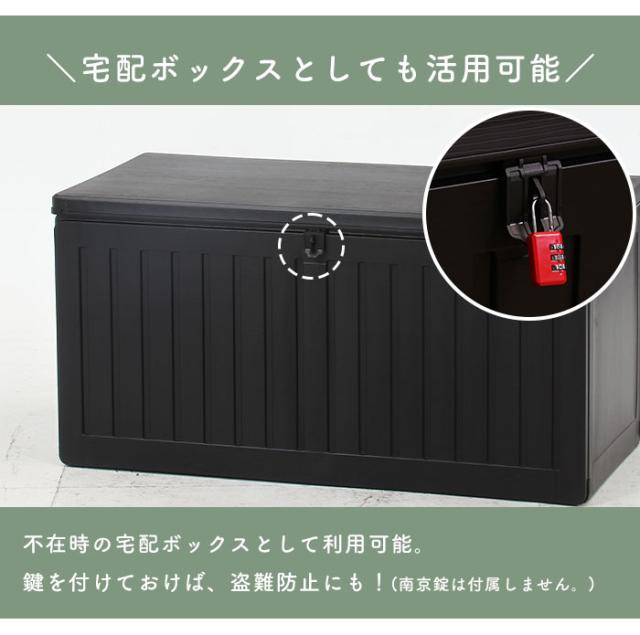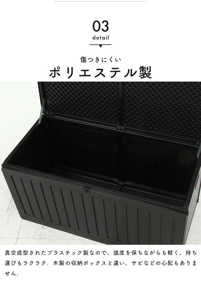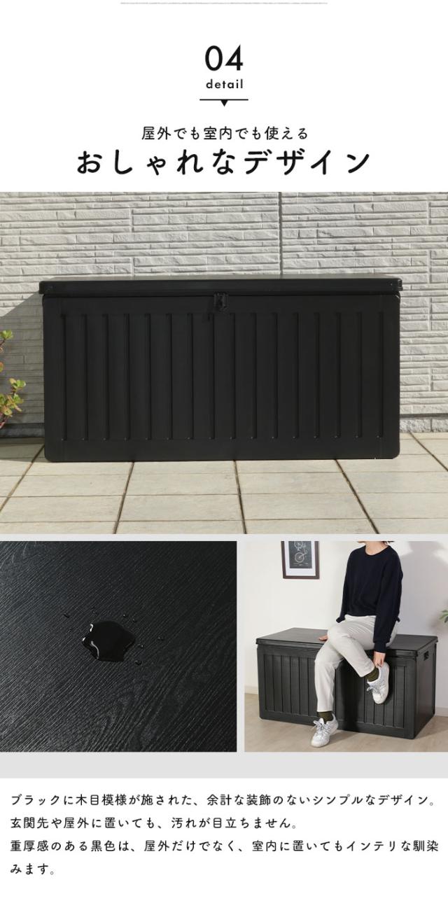 | 屋内でも屋外でも使用できる便利な収納ボックス。 ブラックに木目模様が施されたシンプルなデザインで、玄関先などの屋外やお部屋でもお使いいただけます。 たっぷり収納できるので、ポリタンク収納やゴミ箱、ガーデニング用品の道具入れなど様々なシーンで大活躍。 真空成型されたプラスチック製なので、強度を保ちながらも軽く、水にも強い仕様となっています。 (※防水素材ではありますが、雨ざらしでのご使用はお控えください。) くぼみがあり持ち運びやすい設計で、荷物を収納した状態で持ち上げる際の底耐荷重目安は約5〜10kgとなります。 フタは市販の南京錠で施錠できるので、大切な荷物を守ります。 工具不要ではめこむだけの簡単組立。 |
