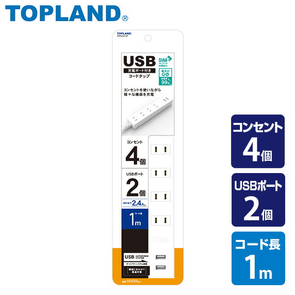 | トップランド TOPLAND 延長コード USB付き電源タップ 節電 抗菌仕様 4個口タップ ケーブル1m 最大出力2.4A仕様 STPA410-WT |