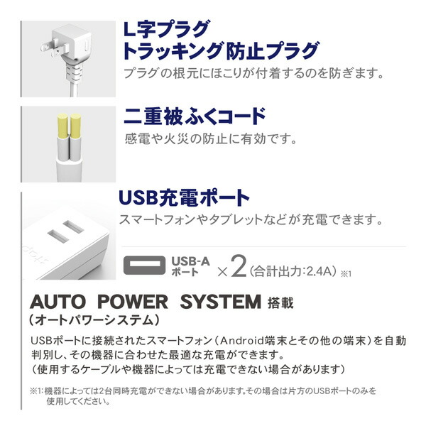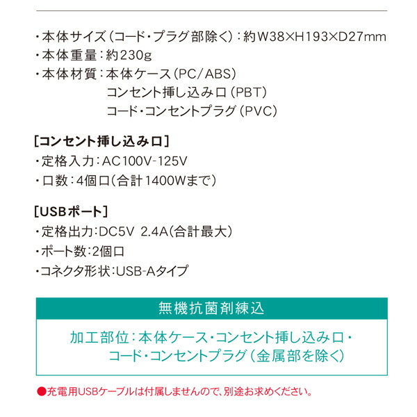 | 商品説明 | ●コンセントとUSBの複合電源タップです ●コンセント4口、USB-Aポート2個を搭載 ●延長コードタイプ ●SIAA抗菌加工 ●壁面に設置しやすいL字プラグ ●合計出力2.4A ●機器に合わせて最適な充電ができます ●コード長さ1m |