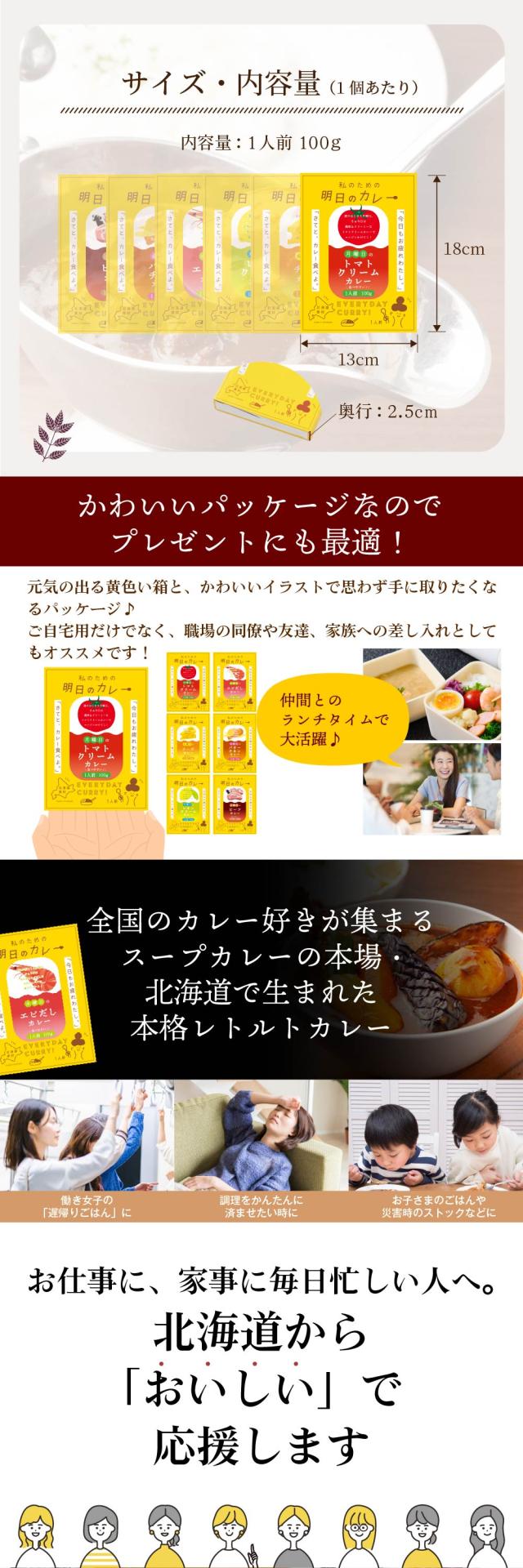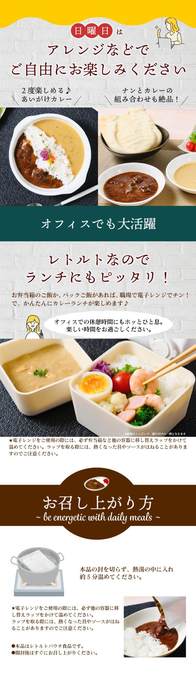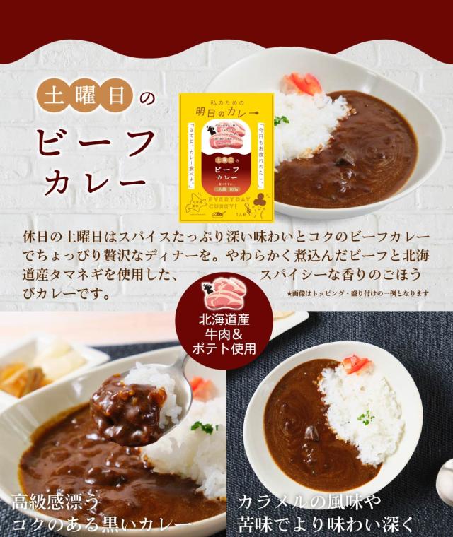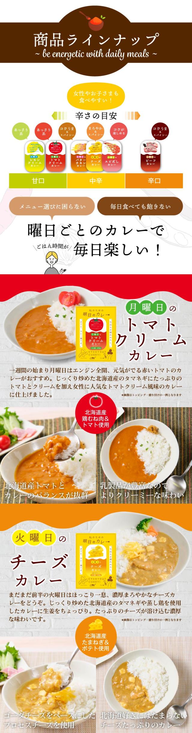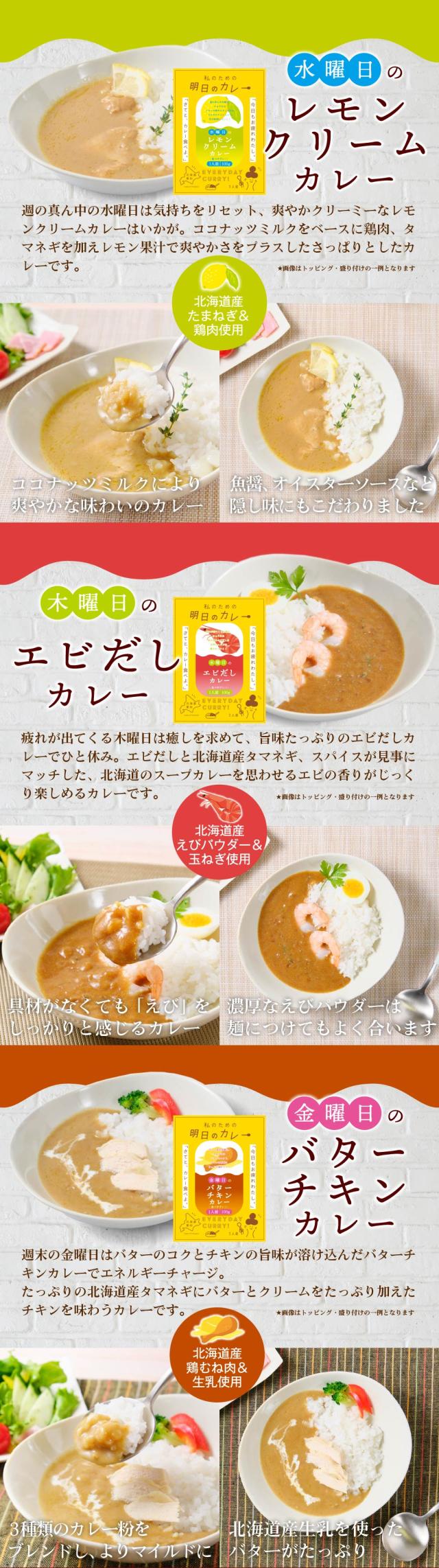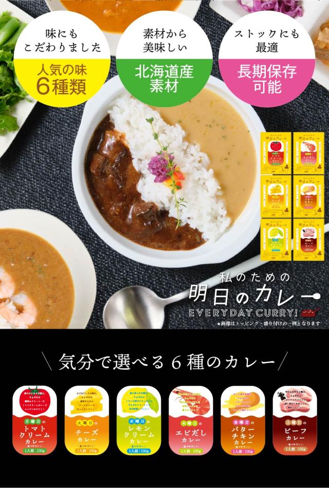 | 商品説明 | 月・火・水・木・金・土と、毎日忙しい日々が続く「私」にちょっぴり1日の楽しみを! 疲れを感じたり、落ち込んだり、気分を切り替えたい時などに、ほっこり、ホッと一息つけるように・・・仕事や家事に忙しい女性を応援したい、そんな気持ちで6 種のカレーが誕生しました! 北海道産の素材にとことんこだわりました。北海道の豊かな自然と生産者の努力により生まれた高品質な牛肉、マッシュポテト、トマト、たまねぎ、牛乳、えびパウダー、そして鶏肉を使用(※)。安心安全な北海道産の食材をたっぷり使い、6種のカレーを作り上げました。 女性でも残さず食べ切れるように内容量を100gにしました。そして、思わず手に取りたくなるようなかわいらしいイラストとやさしい色合いのパッケージもポイント! ご自宅用だけではなく、親しい人へのちょっとした差し入れやプレゼントにも最適です。 ※使用素材はカレーの種類よって異なります。 【水曜日のレモンクリームカレー】 週の真ん中水曜日は気持ちをリセット、爽やかクリーミーなレモンクリームカレーはいかがでしょう。 ココナッツミルクをベースに鶏肉、タマネギを加えレモン果汁で爽やかさをプラスしたさっぱりとしたカレーです。 |