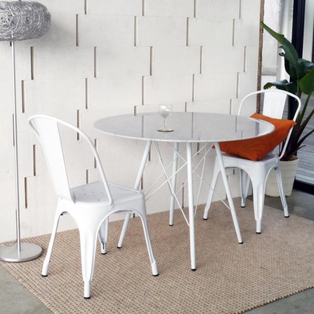 シンプルながら存在感のあるデザインのダイニングテーブルです。高級感のある天然の大理石の天板と、幾何学的なデザインの細身のスチール脚はモダンな雰囲気が漂います。