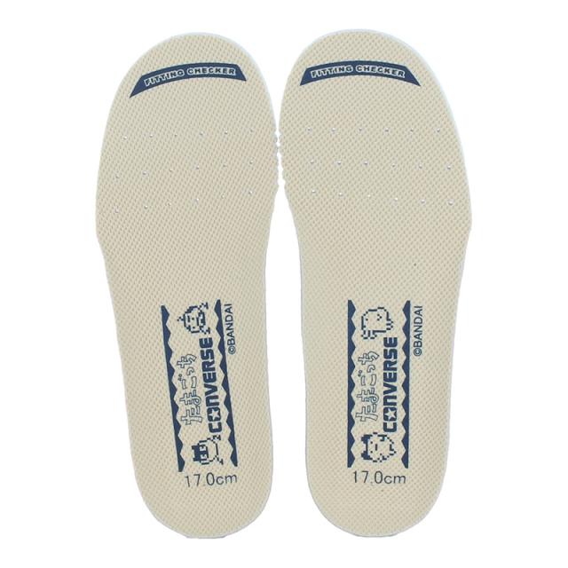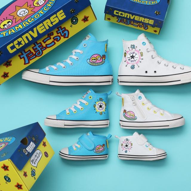 【商品特徴】 オールスターのコラボレーションモデル・1996年11月23日に初代が発売され、いまも幅広い世代に愛される日本を代表するゲーム たまごっちとのコラボレーション・90年代のたまごっちのフォントや時計柄をアンクルパッチに落とし込み、外腰にキャラクターの乗ったUFOをプリントしたポップなデザイン・ゲーム本体の液晶画面を再現したオリジナル織ネームをタンに採用し、たまごっちのピスネームを踵に付加・アンクルパッチの文字をたまごっちフォントで左右それぞれアルファベット(右足)とひらがな(左足)で表記したり、ライニングにはゲーム内でキャラクターの空腹度やごきげんの状態等を知らせるチェックメーターを、インソールには人気キャラクターをプリントしたりと、納得のディテールが満載
