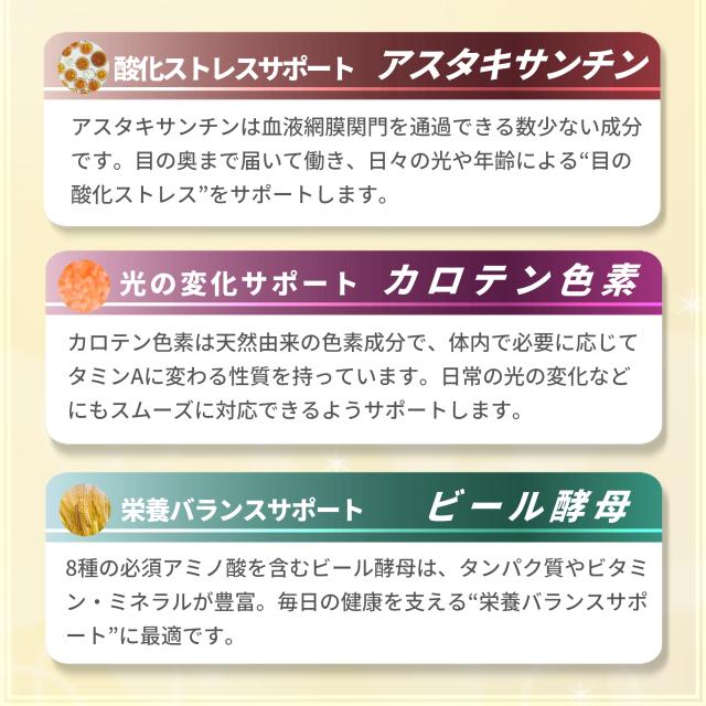 ●高純度プロポリスとルテイン、アントシアニン、アスタキサンチンを主成分として配合。