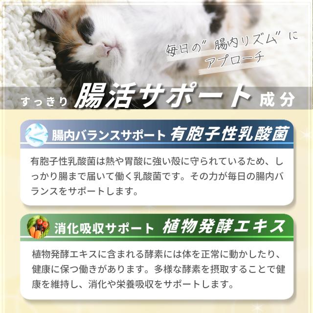 ●腸内に善玉菌、酵素と乳酸菌で健康を維持し腸内環境を保つ天然成分のみ使用した猫用健康サプリメント。