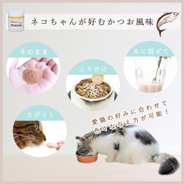 下記を目安に1日1回、または数回に分けて普段の食事キャットフードなどに混ぜて食べさせてください。食欲がない場合はミルク、ヨーグルト、流動食、粉末のスープなどに混ぜて与えるのも良い方法です。