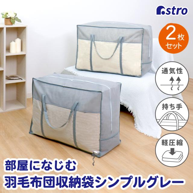 アストロ 収納袋 羽毛布団用 グレー 2枚組 シングル・ダブルサイズ兼用 通気性の良い不織布 収納バッグ 収納ケース 持ち手付き 167-26