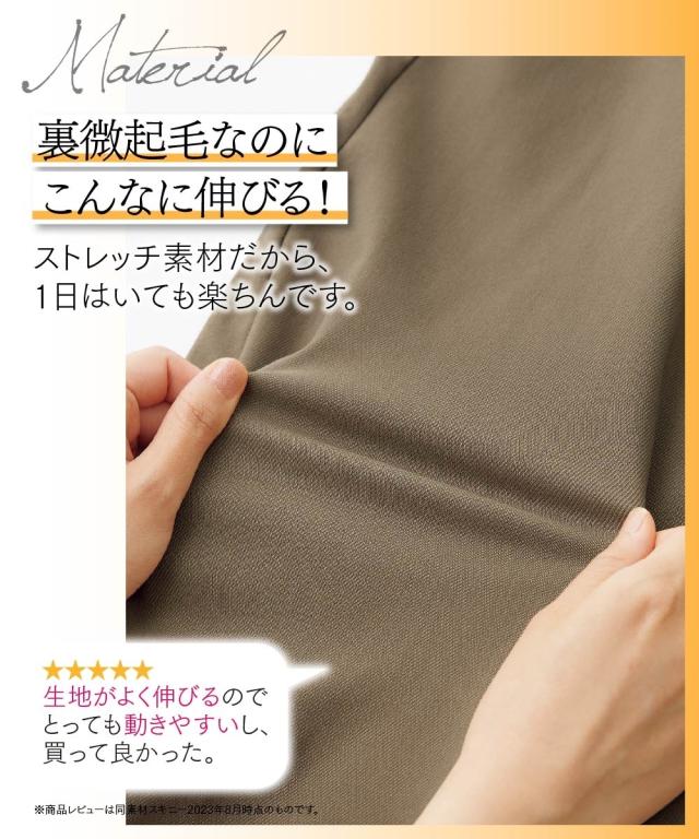 品質:[黒系チドリ]ポリエステル48%・レーヨン38%・ナイロン11%・ポリウレタン3% [その他色]レーヨン77%・ナイロン20%・ポリウレタン3%(織物) 加工の特性上、色の出方(ダメージ等)が多少異なる場合があります。 裏微起毛素材です。 透け感:透けにくい 伸縮性:あり 生地の厚み:普通 光沢感:なし 裏地:なし ポケット:あり ※前2・後2 季節:秋・冬・春 シルエット:普通 原産国:カンボジア製 洗濯表示:洗濯機OK