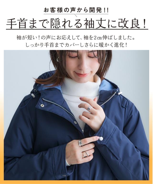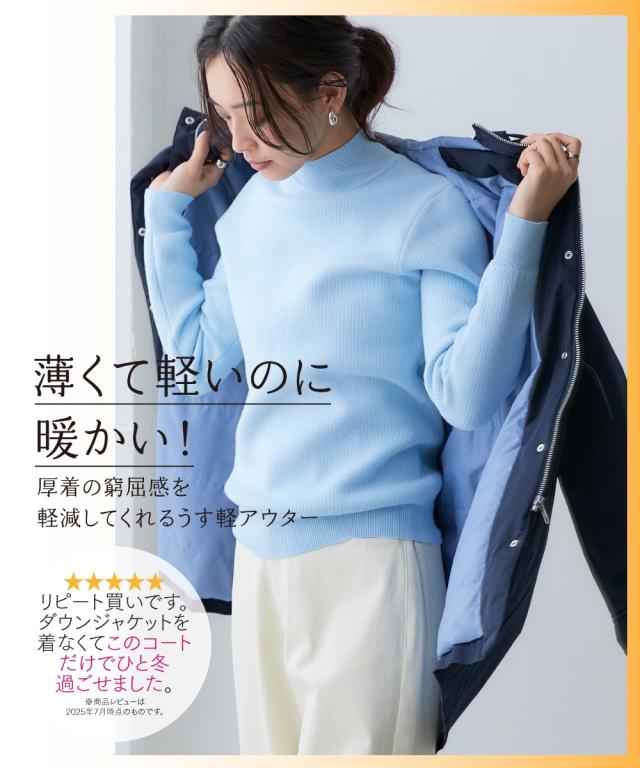 - 通勤が自転車と電車なので、暖かくて着膨れせず軽いコートを探していました。 冷え性なので、真冬はどうか分からないですが今は満足です。