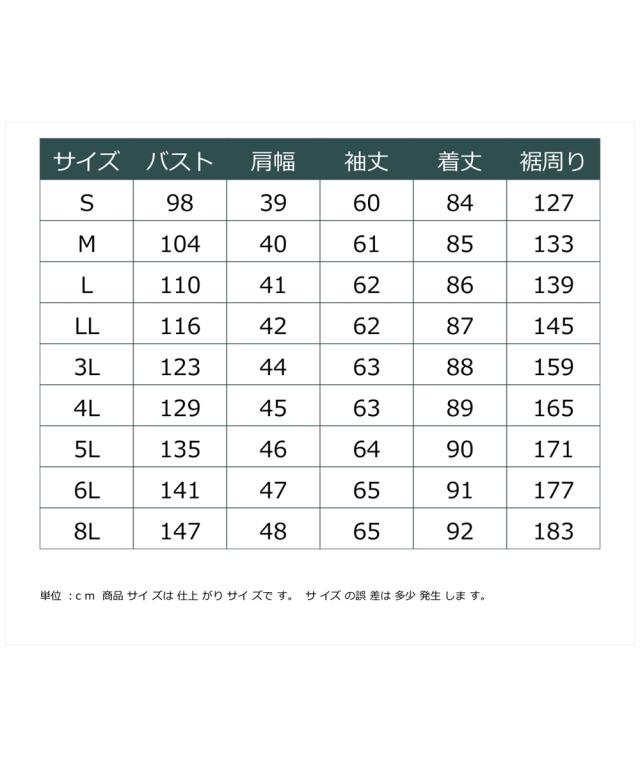 品質:[表地・中綿]ポリエステル100%(織物)袖口ボタン開 前ファスナー・ボタン開 裏地:有 蓄熱中綿使用 表地ラミネート加工(防風) 透け感:透けにくい 伸縮性:なし 生地の厚み:厚い 光沢感:ややあり 裏地:あり ポケット:あり ※両脇 季節:晩秋・初冬・梅春 シルエット:普通 重量:S約450g、M約480g、L約510g、LL約540g、3L約570g、4L約600g、5L約630g、6L約660g※多少の個体差が生じる場合があります。 原産国:ミャンマー製 備考:洗濯機OK ネット使用 ※単位:cm ※商品サイズは仕上がりサイズです。 ※サイズの誤差は多少発生します。