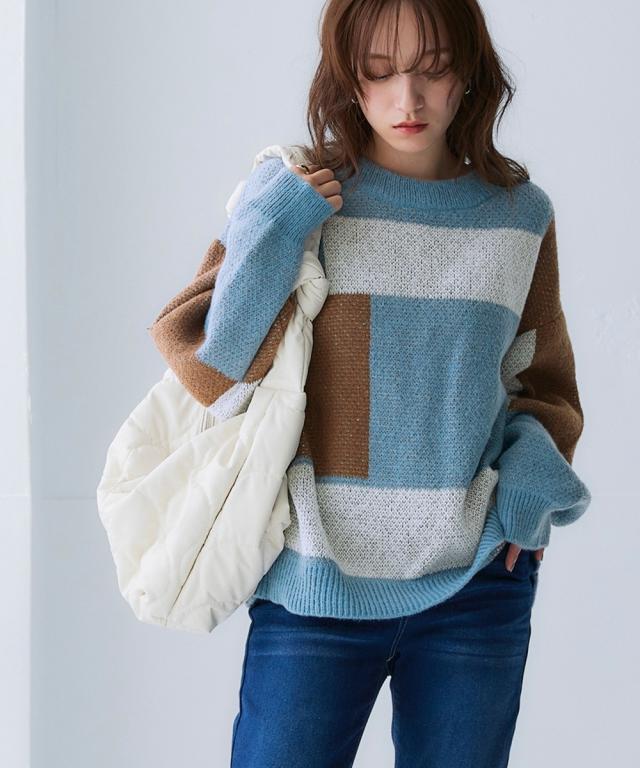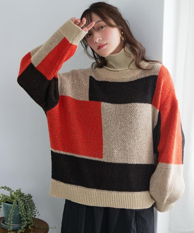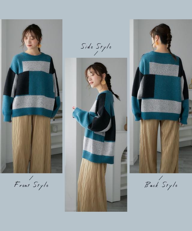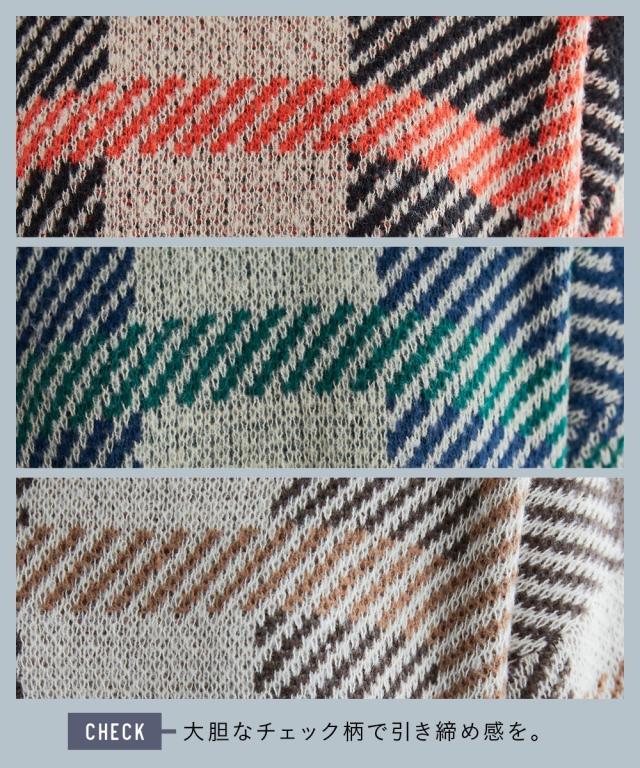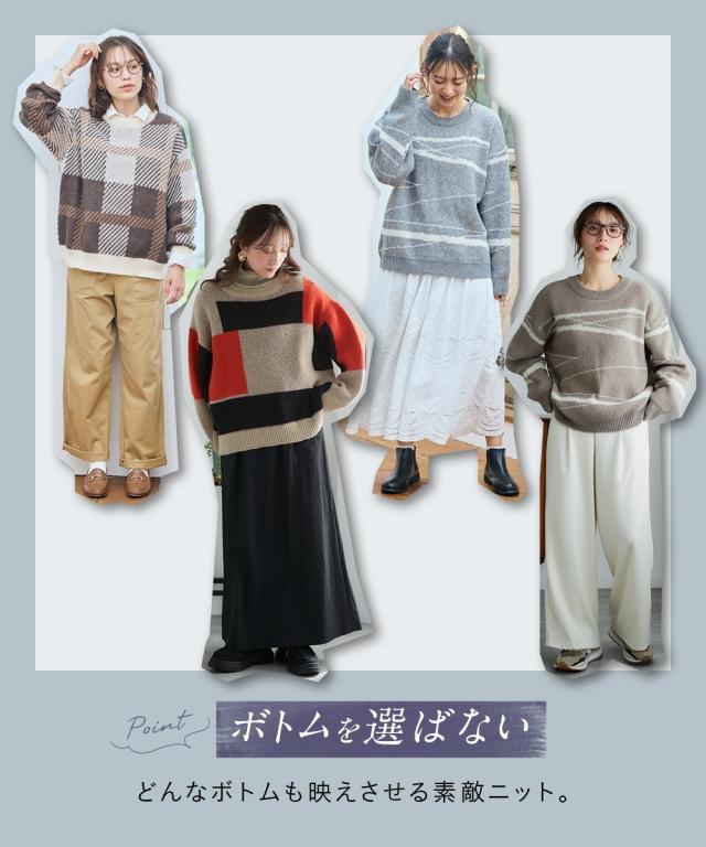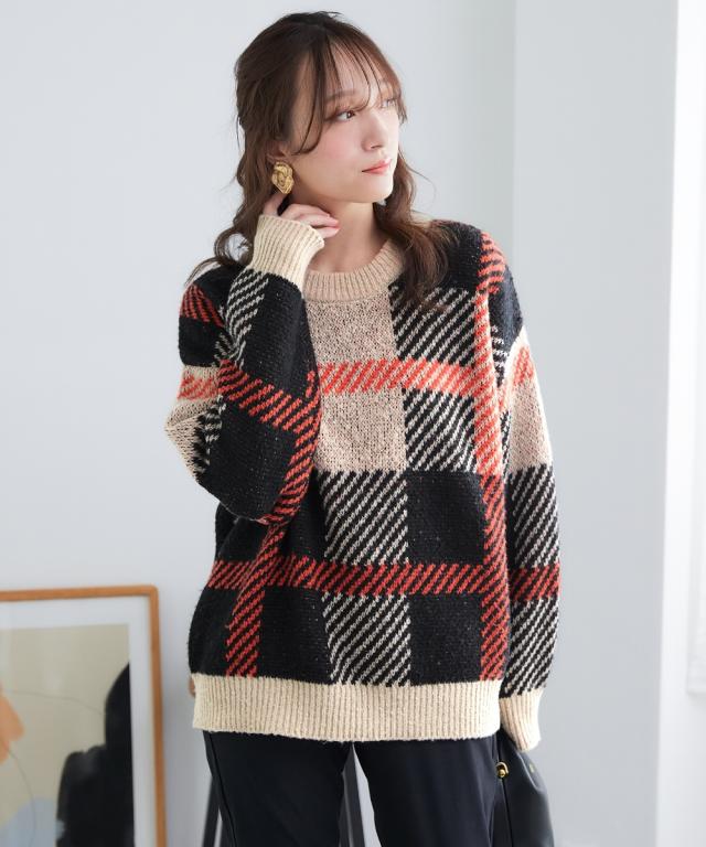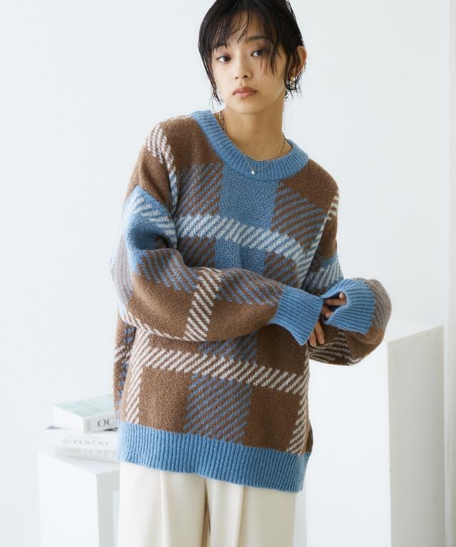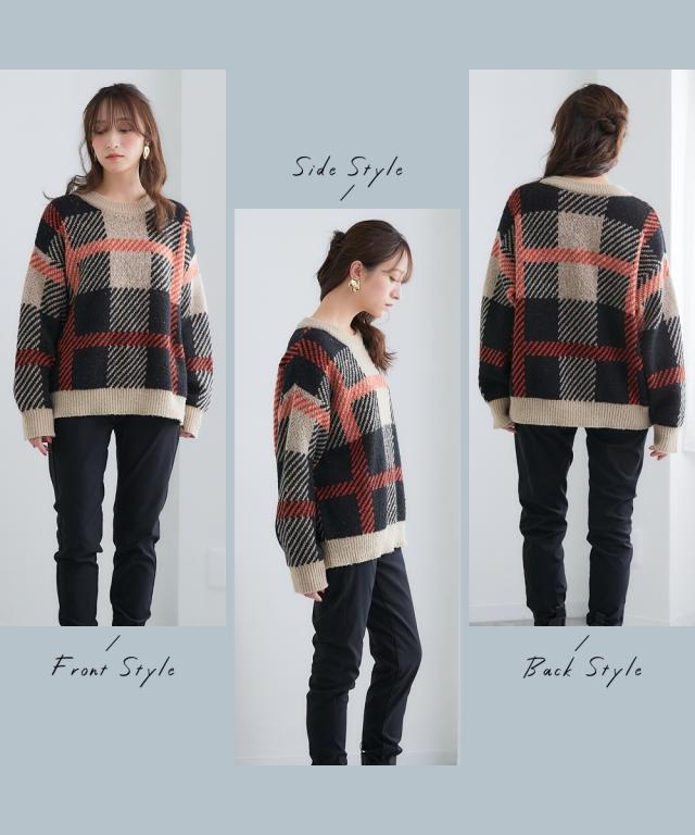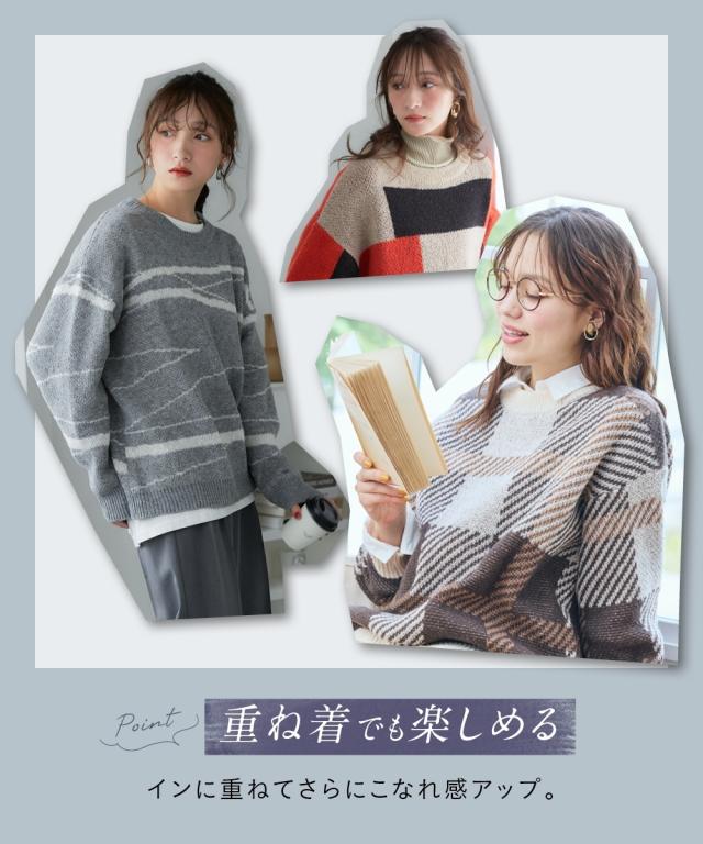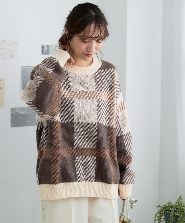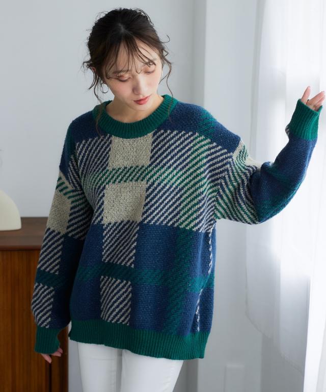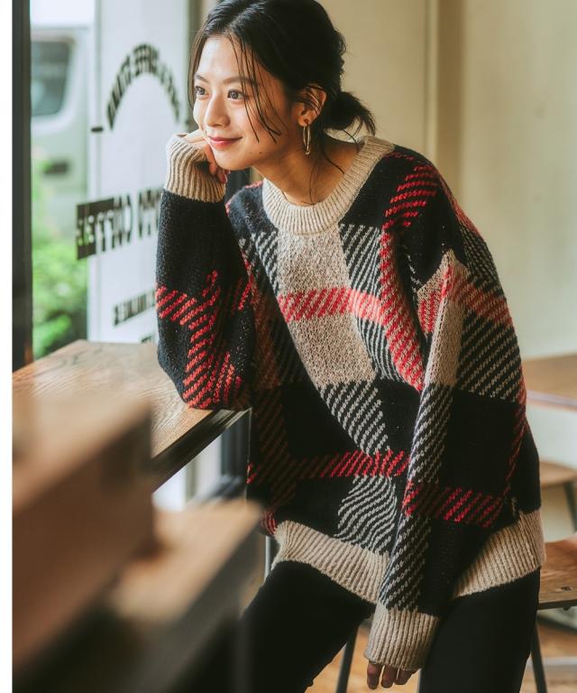 秋冬コーデを華やかに!暗くなりがちな冬コーデに明るさをプラスしてくれる配色チェックニット オーバーサイズで、どんなボトムとも相性がよく今らしく着こなせます 存在感のあるニットアイテムなので、合わせるアイテムがシンプルでも様になります ■デザイン きれいな、落ち着いたカラーの配色がチェックがかわいいニット 太目のリブで切り替えたクルーネックが顔まわりをすっきり見せてくれます ■素材 ローゲージでしっかりと編まれたジャガードニット ふんわりもちっとした弾力が魅力!肌触りも柔らかいので着心地もいいです ポリエステル100%なのでチクチク感はあまりありませんが、気になる方は長袖のインナーをご着用ください