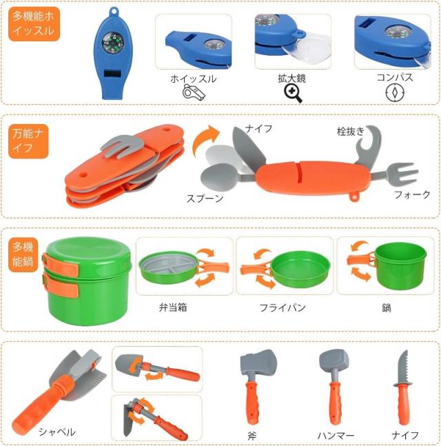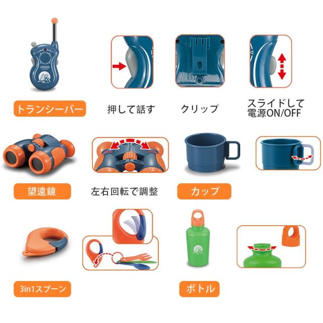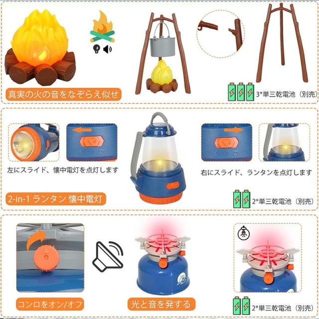 【キャンプの日】模擬キャンプ効果いっぱい!本物の焚き火の音を聞いたり、明るい火影、焚き火が目の前に燃えたり、野生の昆虫を捕まえたり、自分の作った料理を味わったり。ランプを点けて、夜の中で夜の神秘を探し、昼に、双眼鏡を利用して、遠くいる鳥を観察します。ArtCWKキャンプごっこセットはいつも子供たちの夢と好奇心をそそることができます。