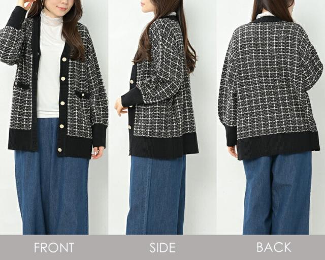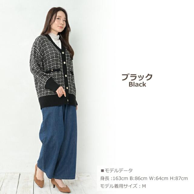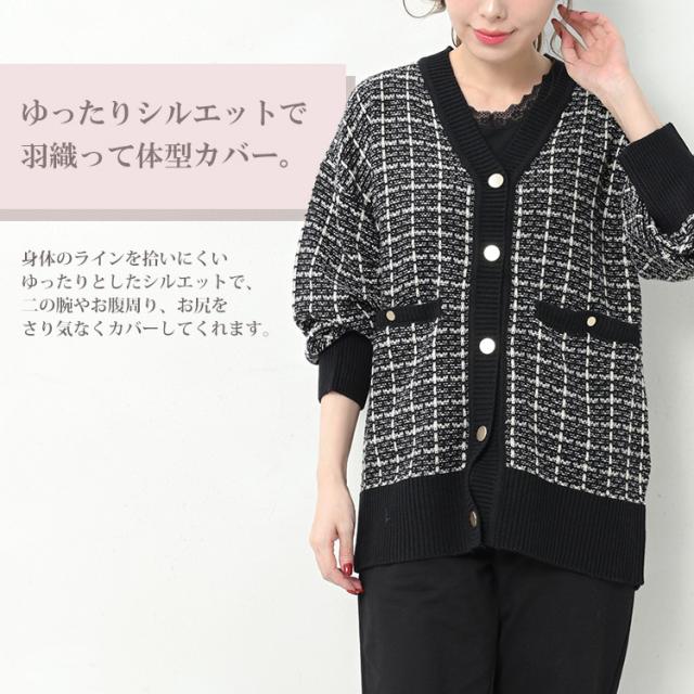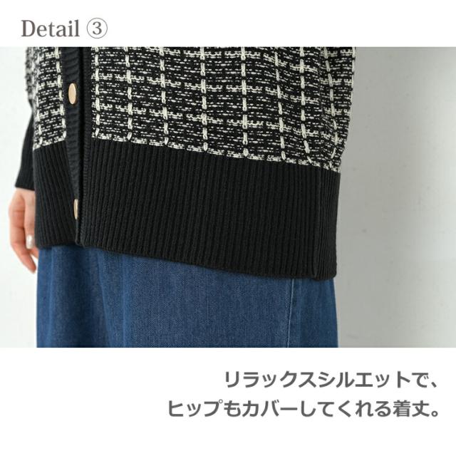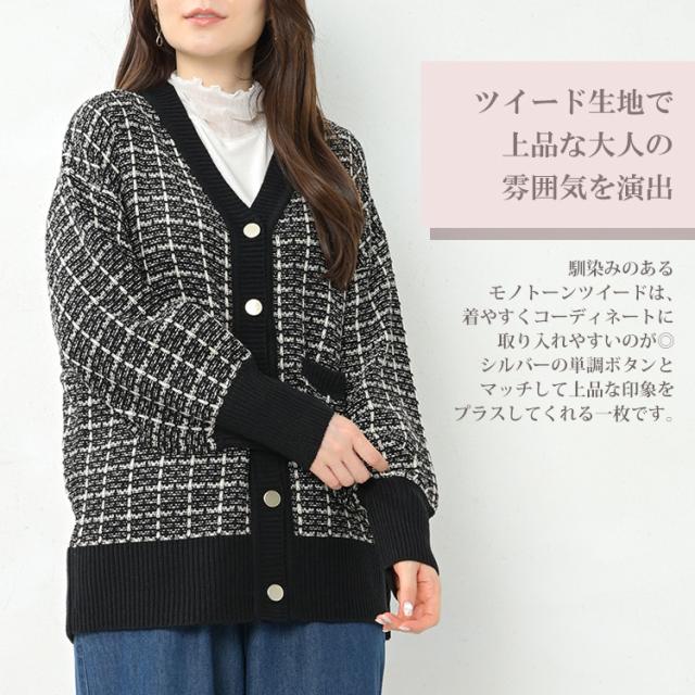 馴染みのあるツイードで上品さを演出するニットカーディガン。 長袖 トップス 30代 40代 50代 春服 秋服 冬服 春物 秋物 冬物 2023 あったかい 体型カバー 羽織り 上品 オフィス カジュアル おしゃれ きれいめ ゆったりサイズ ぽっちゃり女子 プラスサイズ 大きいサイズ レディース 長袖トップス 長袖カーディガン ツイードカーディガン ニットカーディガン リブニット 羽織り 上着 ニットジャケット カーデガン カーデ 長袖 リブ袖 リブ裾 ツイード生地 Vネック ライトアウター ミドル丈 長めの着丈 お尻が隠れる着丈 お尻すっぽり丈 チュニック丈 ポケット サイドスリット 春服 秋服 冬服 春物 秋物 冬服 春トップス 秋トップス 冬トップス 春カーデ 秋カーデ 冬カーデ 前開きデザイン 前開きボタン フロントボタン ゆったり 大きめ あったかい 暖かい 保温性 防寒 冷え対策 プラスワン 上品 大人 カジュアル ナチュラル フェミニン ガーリー オフィスカジュアル きれいめ かわいい 着こなし おしゃれ 定番 春コーデ 秋コーデ 冬コーデ ファッション 大きめ 女性 婦人用 ミセス 30代 40代 50代 2023 春 秋 冬 黒 白 M 3L 4L 5L 9号 15号 17号 19号 cam-saw-tp0250