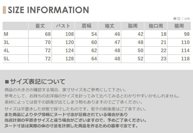 5L:着丈72 バスト128 肩幅64 袖丈48 脇周52 袖口周23 裾周118
