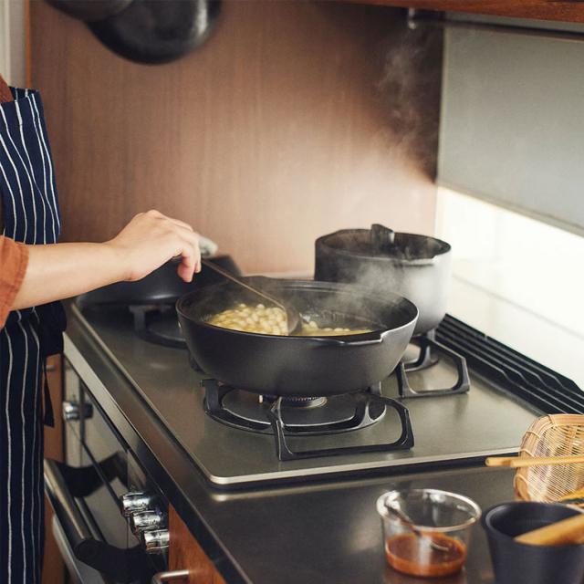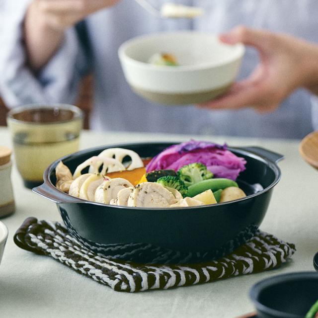 ガスレンジでの直火調理はもちろん、電子レンジ、オーブンで使える耐熱陶器製のかこみ鍋。テーブルに並んだ器とも調和する佇まいです。