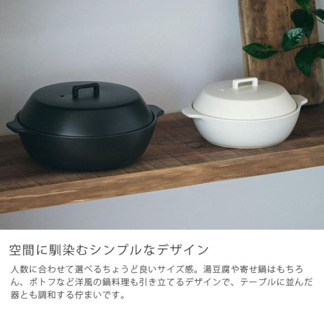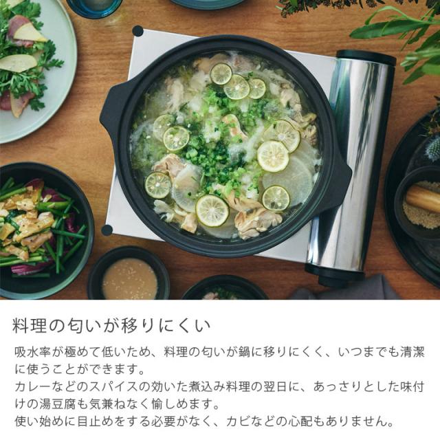 一般的な陶器に比べて丈夫で割れにくく、軽くて扱いやすい土鍋です。吸水率が極めて低いため、料理の匂いが移りにくく使い始めに目止めをする必要もありません。