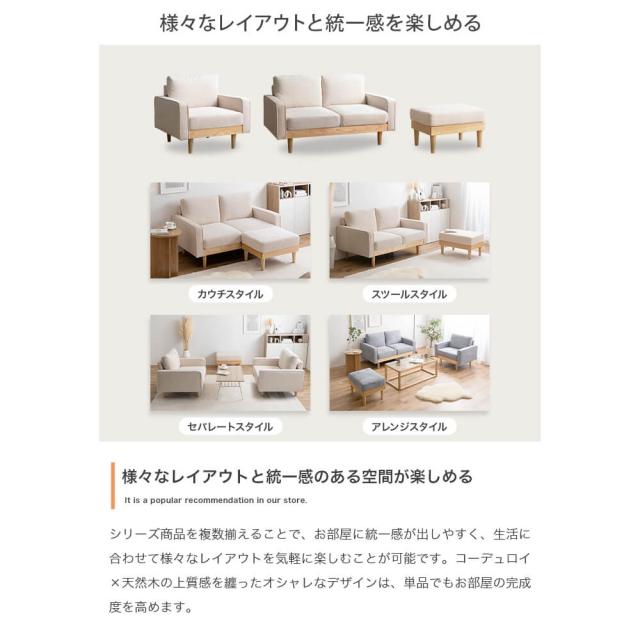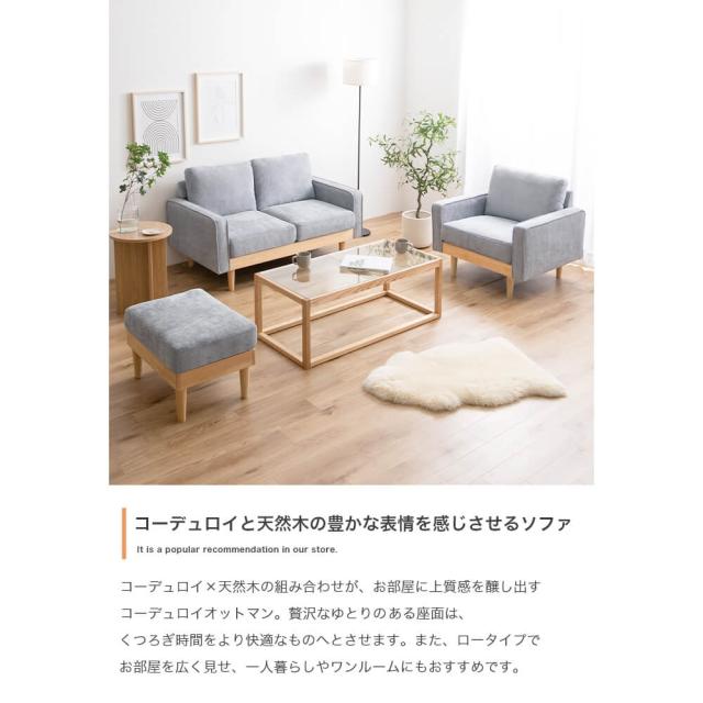 コーデュロイ×天然木のデザインがお部屋に贅沢な雰囲気をもたらします。このソファは座面に豊かなゆとりを備えており、くつろぎの時間を一段と快適にしてくれます。また、そのロータイプのデザインは、お部屋を広々と感じさせ、一人暮らしやワンルームの方に特におすすめです。