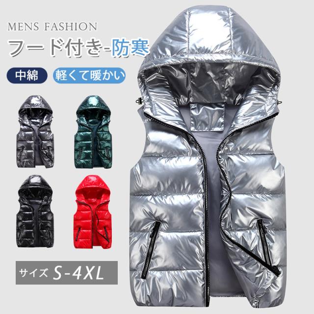 フード付き ダウンベスト メンズ 中綿ベスト 中綿入り チョッキ インナーベスト ブルゾン アウター 暖かい 防寒着 前開き 秋冬コート