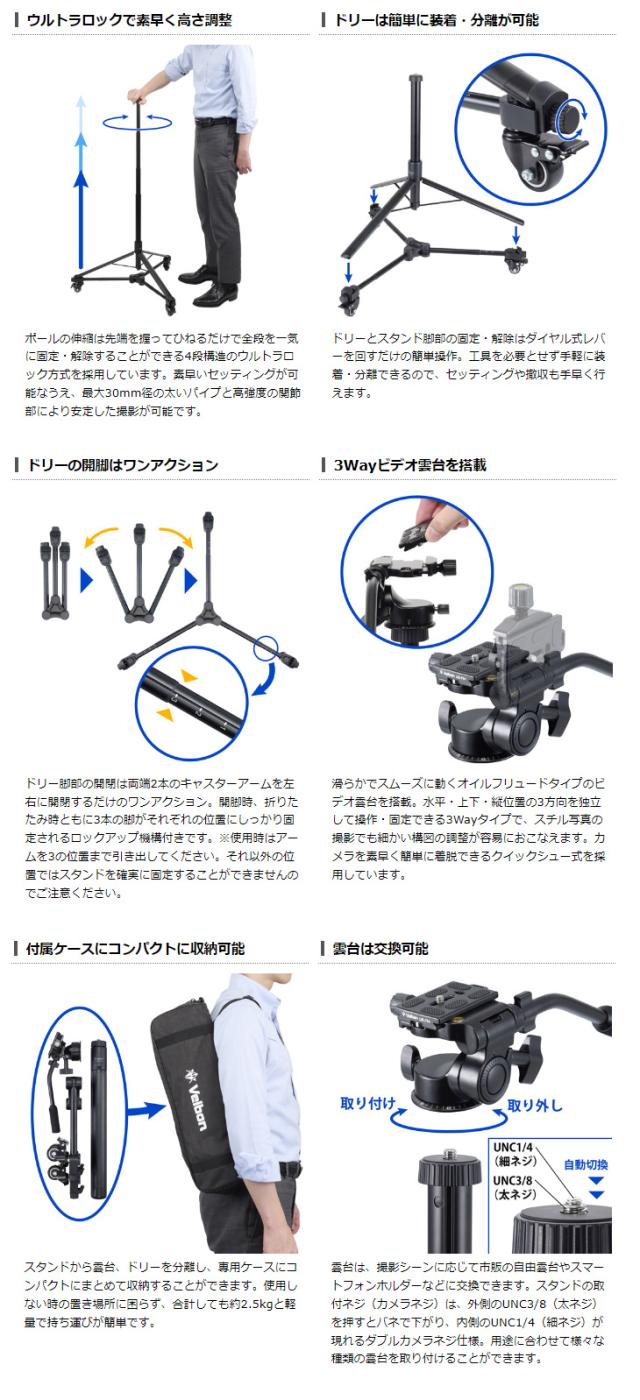 ポールの伸縮は先端を握ってひねるだけで全段を一気に固定・解除することができる4段構造のウルトラロック方式を採用しています。素早いセッティングが可能なうえ、最大30mm径の太いパイプと高強度の関節部により安定した撮影が可能です。