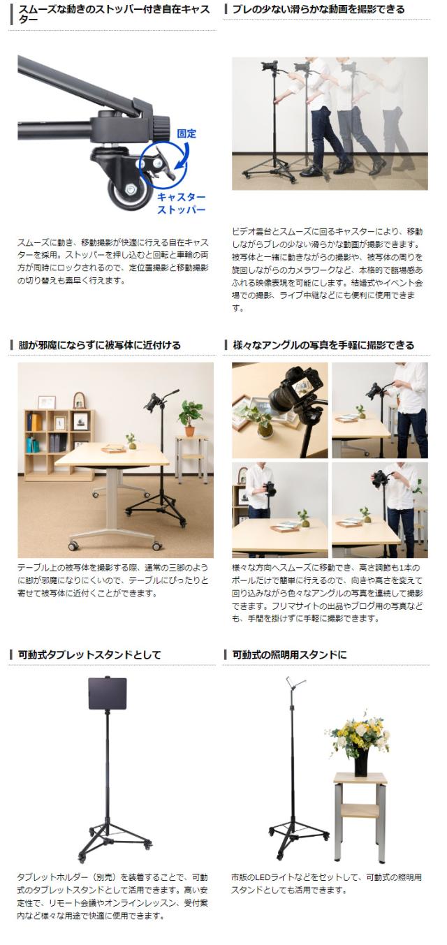 移動しながらブレの少ないスムーズな動画撮影や、回り込みながら様々なアングルでの撮影が手軽にできるキャスター付きの軽量ドリーポッド。