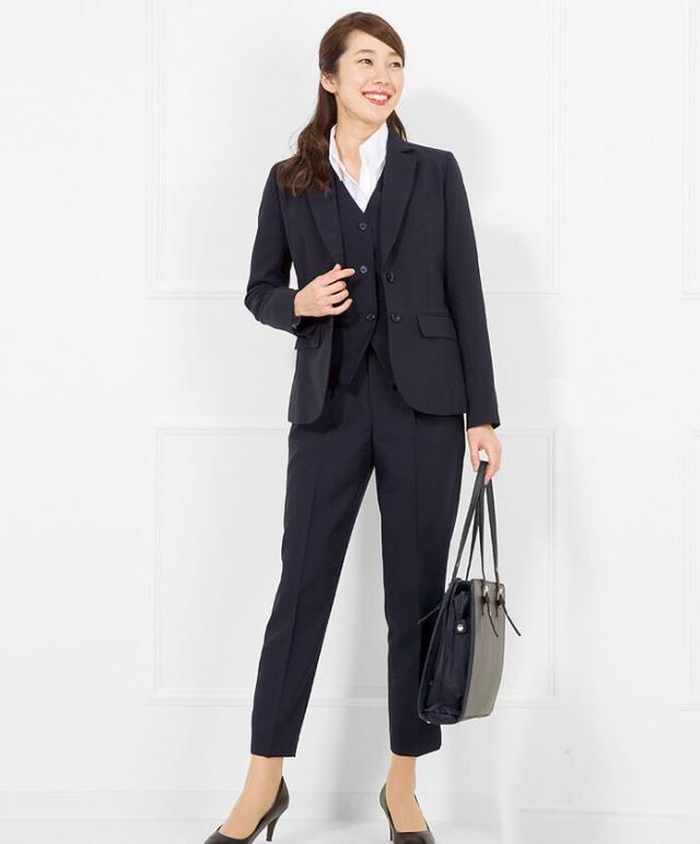 インナーにはリボン付きブラウスや、ピンクなどの色物を合わせても、それぞれの企業らしさを出すことができます。