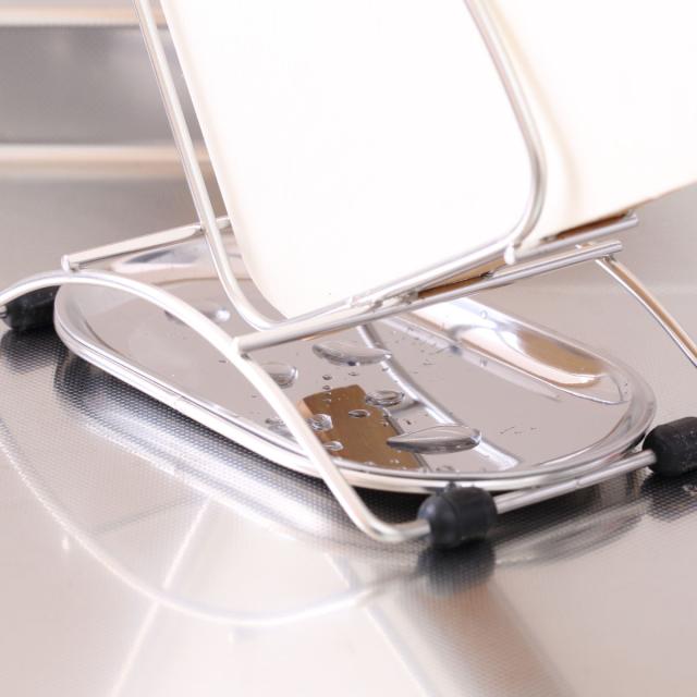 水受け用のステンレストレーが付いているので、周りを濡らさずに使用できます。水切りマット不要で、スタンド単体で便利にお使いいただけます。