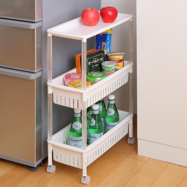 調味料や乾物のストックにちょうど良いオープンタイプのキッチンワゴンです。幅22cmとスリム設計なので、ちょっとしたすき間を収納として有効活用できます。