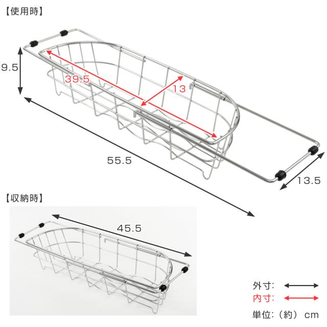 | サイズ | 約 幅13.5×奥行45.5〜55.5×高さ9.5(cm) バスケット内寸:約 幅13×奥行39.5(cm) シンク対応サイズ:約43〜51cm |