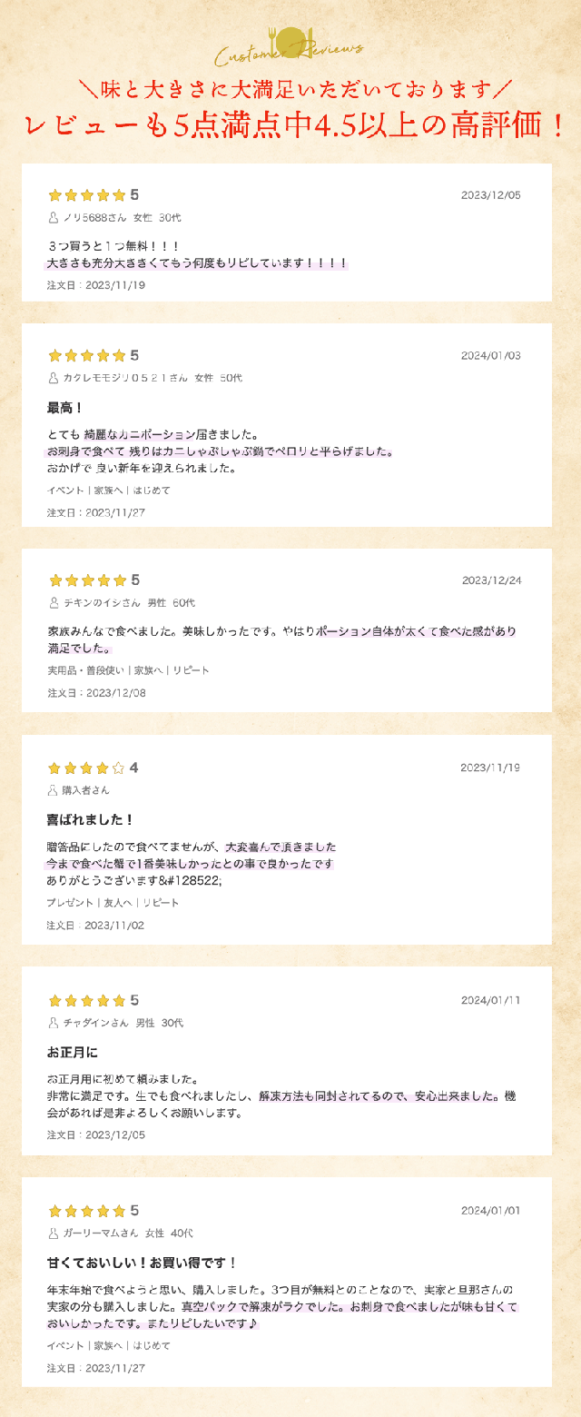 - 母に送りました。とても綺麗なカニだったとの事で、こんなにお得に購入できるなんて感激です!ありがとうございました。
