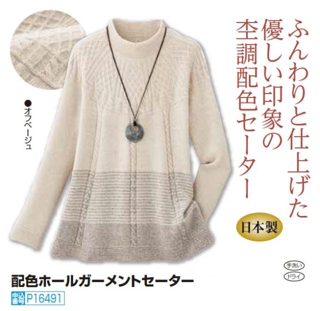ニット セーター レディース シニア 日本製 配色ホールガーメントセーター オフベージュ 婦人服 ミセス 女性 ハイネック モックネック グラデーション アクリル ウール アンゴラ シニアファッション 40代 50代 60代 70代 80代 母の日 お母さん 秋物 冬物 秋冬 nss p16491
