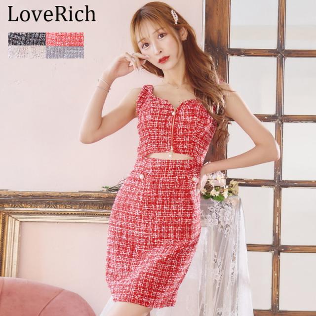LoveRich ラブリッチ 【SMLサイズ/4カラー】ツイード パール ジップ ノースリーブ 谷間魅せ ボタン タイト ミニドレス キャバドレス [1267]