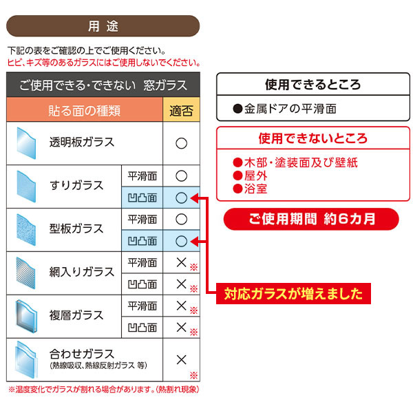 使用できないところ網入りガラス、複層ガラス、合わせガラス、木部・塗装面及び壁紙、屋外、浴室