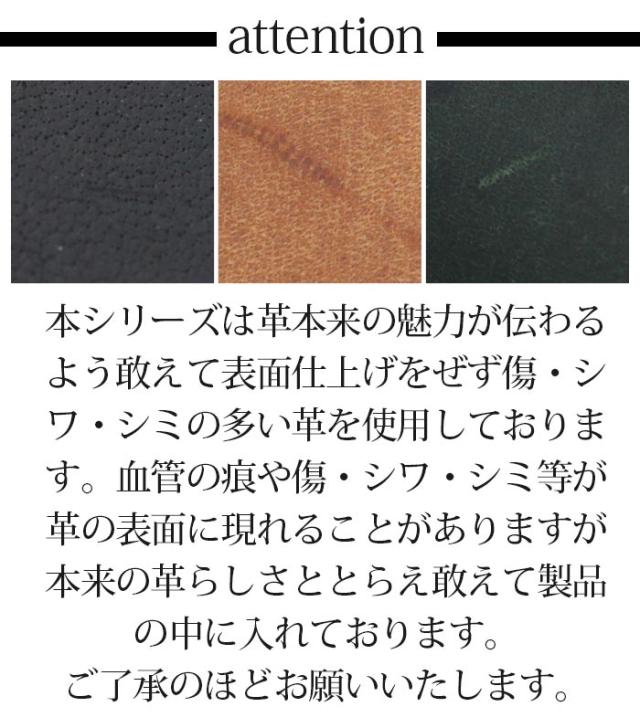※本シリーズは革本来の魅力が伝わるよう敢えて表面仕上げをぜず傷・シワ・シミの多い革を使用しております。血管の痕や傷・シワ・シミ等が革の表面に現れることがありますが本来の革らしさととらえ敢えて製品の中に入れております。ご了承のほどお願いいたします。