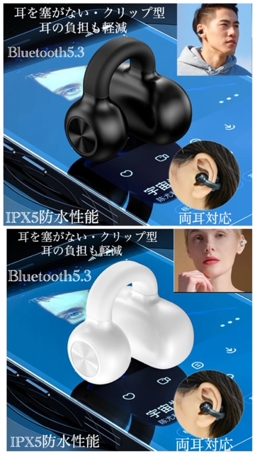 1 Bluetooth5.3 イヤホン ワイヤレスイヤホン IPX5 空気伝導イヤホン クリップ型 防水 耳掛け スピーカー マイク 片耳 USB 充電 超軽量 テレワーク