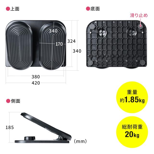 ●足置き台として使用でき、ペダルを踏むように足首を動かすことができるフットレストです。●しっかり踏み込める強めのバネと、踏み込んでも傷がつきにくく音がしにくいゴム付きです。