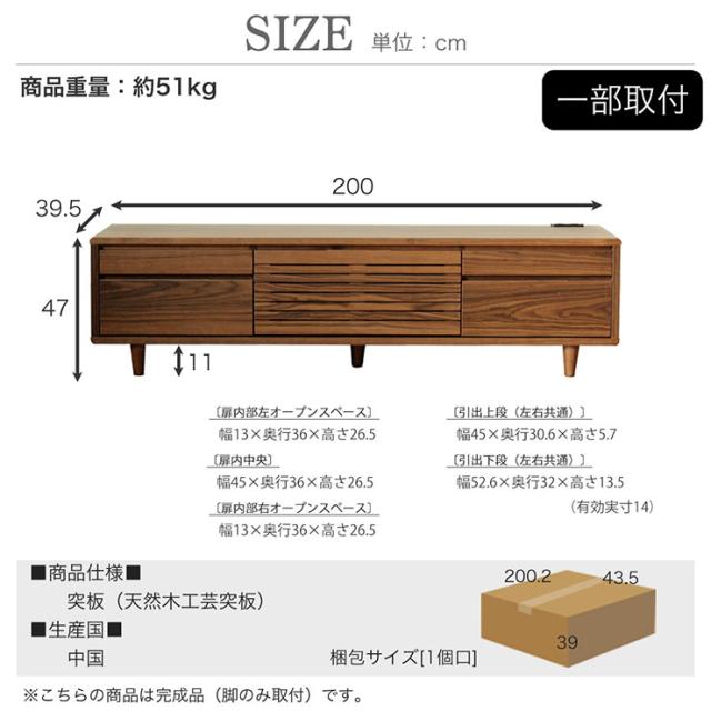 完成品 テレビボード テレビ台 幅200cm 2色対応 ロータイプ ハイタイプ TVボード AVボード 引き出し コンセント 扉付き 収納 リビング 突板 木製 ウォールナット ナチュラル おしゃれ