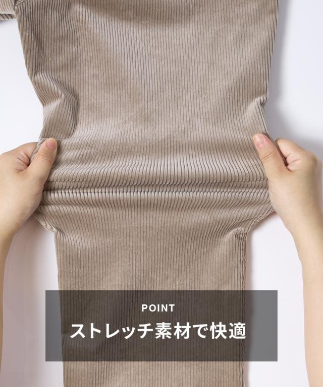 品質=綿95%・ポリウレタン5%(織物 コーデュロイ) [裏地]なし 透け感:なし 伸縮性:あり 生地の厚み:普通 光沢感:ややあり 裏地:なし ポケット:あり(前2) 季節:春・秋・冬向き シルエット:普通 原産国:中国製 洗濯表示:手洗い