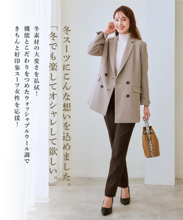 ◆洗えるウール調セットアップカセット服でお仕事服もおしゃれ&快適に冬シフト◆こなれ感ときちんと感両方かなうダブルブレストジャケットで体型カバーもかなえます ■デザイン ・ゆったりこなれ感のあるダブルジャケット・気になるヒップやお腹回りをカバーできるロング丈・パンツにもスカートにも着合わせOK! ■素材 ・冬素材ってお手入れが大変なイメージではありませんか・こちらのシリーズは合繊でいてウール調のウォーミーな見た目を追求しながらも、お家洗いできて経済的☆わざわざクリーニングに出す必要がありません!・毎日の通勤着としての着心地とお手入れにこだわり、家庭洗濯OK・横ストレッチ・防しわと機能が満載です。 ■おすすめのスタイリング ・同素材のボトムと合わせてきりっとセットアップスーツとして、またカジュアルなボトムやインナーを合わせてビジカジスタイルに、など幅広いスタイリングを楽しめます!・初冬から春までロングシーズン、セットアップから単品使いは勿論、お仕事からライトオケージョンまで着こなしの幅の広さもお楽しみください。
