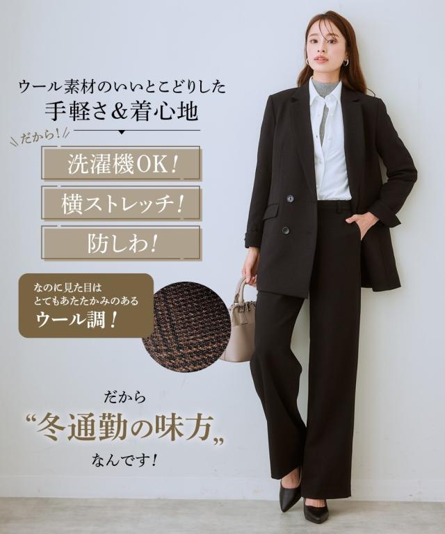 ◆洗えるウール調セットアップカセット服でお仕事服もおしゃれ&快適に冬シフト◆こなれ感ときちんと感両方かなうダブルブレストジャケットで体型カバーもかなえます ■デザイン ・ゆったりこなれ感のあるダブルジャケット・気になるヒップやお腹回りをカバーできるロング丈・パンツにもスカートにも着合わせOK! ■素材 ・冬素材ってお手入れが大変なイメージではありませんか・こちらのシリーズは合繊でいてウール調のウォーミーな見た目を追求しながらも、お家洗いできて経済的☆わざわざクリーニングに出す必要がありません!・毎日の通勤着としての着心地とお手入れにこだわり、家庭洗濯OK・横ストレッチ・防しわと機能が満載です。 ■おすすめのスタイリング ・ジレでもワンピースでも活躍するから着こなしに幅が出ます!・初冬から春までロングシーズン、セットアップから単品使いは勿論、お仕事からライトオケージョンまで着こなしの幅の広さもお楽しみください。