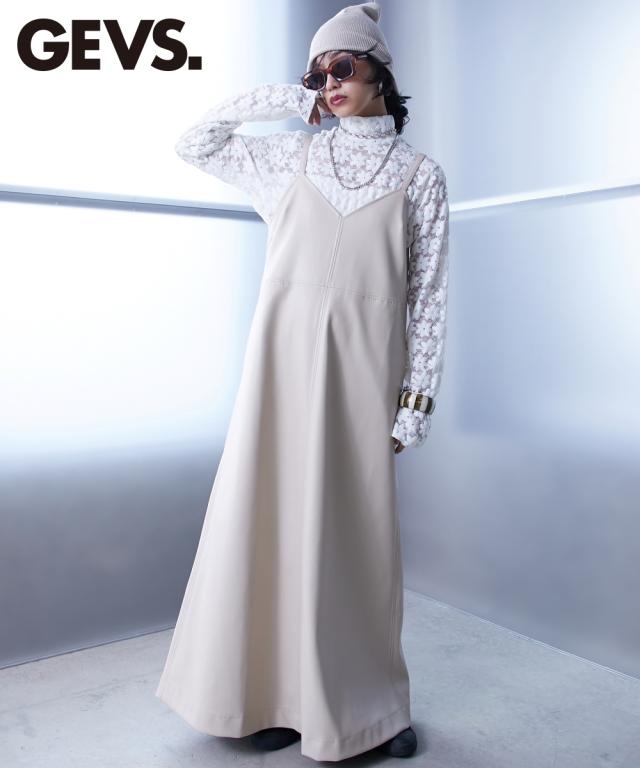 ジャンパー スカート 大きいサイズ レディース フェイクレザー キャミソール マキシ ワンピース GEVS. オフベージュ/黒 L/LL/3L/4L/5L ニッセン nissen