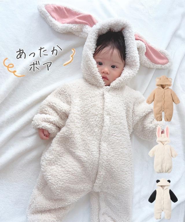 [keyword] ベビー服 ベビー用品 赤ちゃん 幼児 マタニティ 妊娠 長袖 ロングスリーブ おしゃれ あったか 暖か あたたか 寒さ対策 防寒 冬 着ぐるみ コスプレ かわいい パーティ 集まり 友だち 女の子 女児 キッズ ジュニア 小学生 中学生 男の子 男児 [comment] もこもこクマちゃんやうさぎちゃんになっちゃう!あったかボアのカバーオール・ツーウェイオールです ■design ・ぬいぐるみ感がすごい! 着るだけでかわいいクマちゃんやうさぎちゃんになれる ・フードには立体的なお耳付 ・カバーオールサイズのお尻にはまんまるしっぽ有 (ツーウェイオールは寝ていることが多いベビーちゃんの邪魔にならないようについていません) ■point ・サイズによって、カバーオールとツーウェイオールが選べます 70・80のサイズはカバーオール、身長50〜60cmがツーウェイオールになります ・カバーオールサイズもツーウェイオールサイズも全開にできるので、寝たままのお着替えもラクチン ・ツーウェイオールサイズはおむつ替えが頻繁な新生児期はドレスとして 足がバタバタし出したらボタンを留め替えてカバーオールとして 2WAY仕様なので、産まれてすぐから生後半年頃まで長くお使いいただけます! ・ス