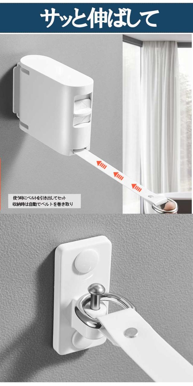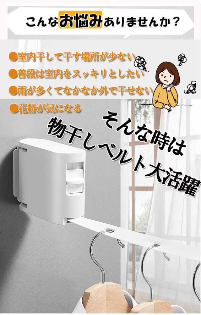 室内 物干し ベルト 巻き取り ロープ 部屋干し 壁 取付 雨 梅雨 花粉 対策 ずり落ち 防止 ハンガー穴 長さ4.2m 幅2cm 耐荷重20kg 白 黒 紐 物干し 部屋干し ワイヤー ベルト 壁付け 巻き取り180°回転