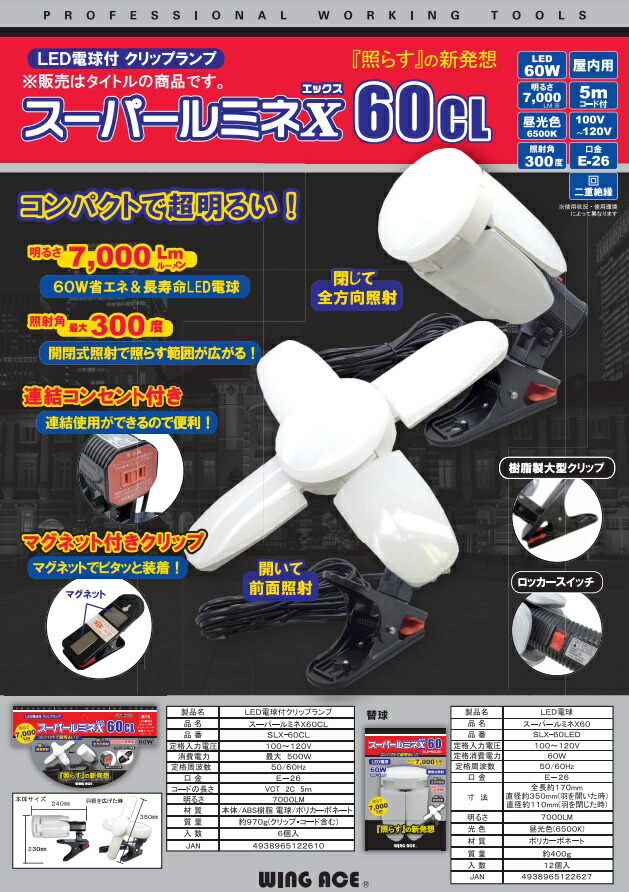 WING ACE スーパールミネX 60CL SLX-60CL LED電球付 クリップランプ 最大7000Lm ウイングエース 122610 ♪
